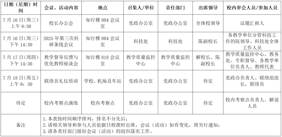 2025年春季学期第二十二周全校性会议活动安排表