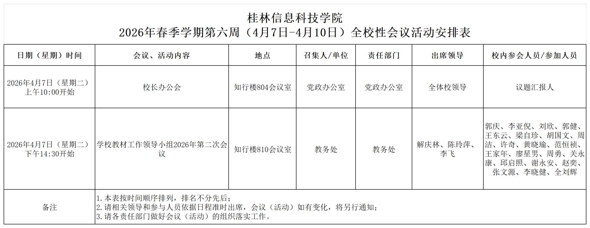 2026年春季学期第六周全校性会议活动安排表