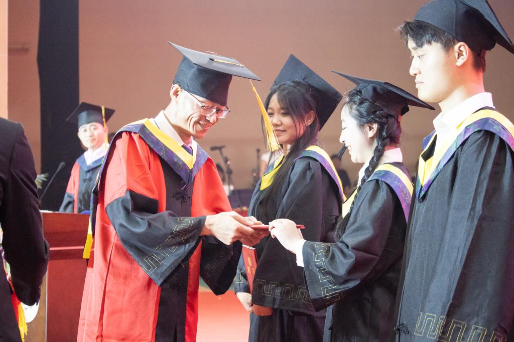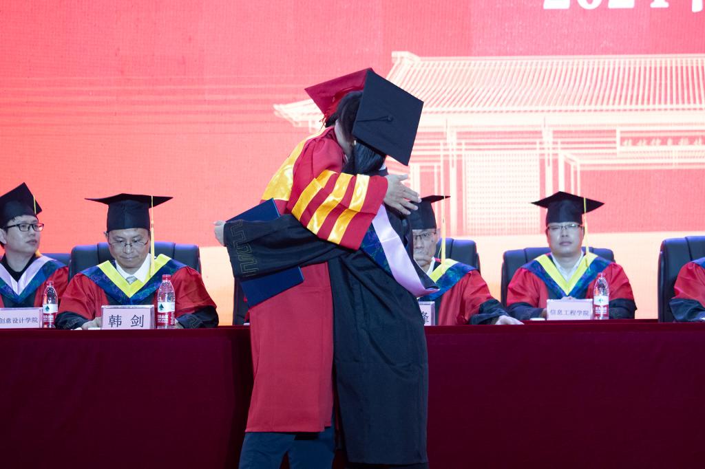 在毕业典礼最激动人心的学士学位授予仪式中,解庆林校长为毕业生一一拨穗、颁发学士学位证书。现场掌声不断,隆重而又不失活泼,上台的毕业生代表通过各种方式与校长亲切互动,享受毕业礼成的开心时刻,感谢了对母校的感激之情。