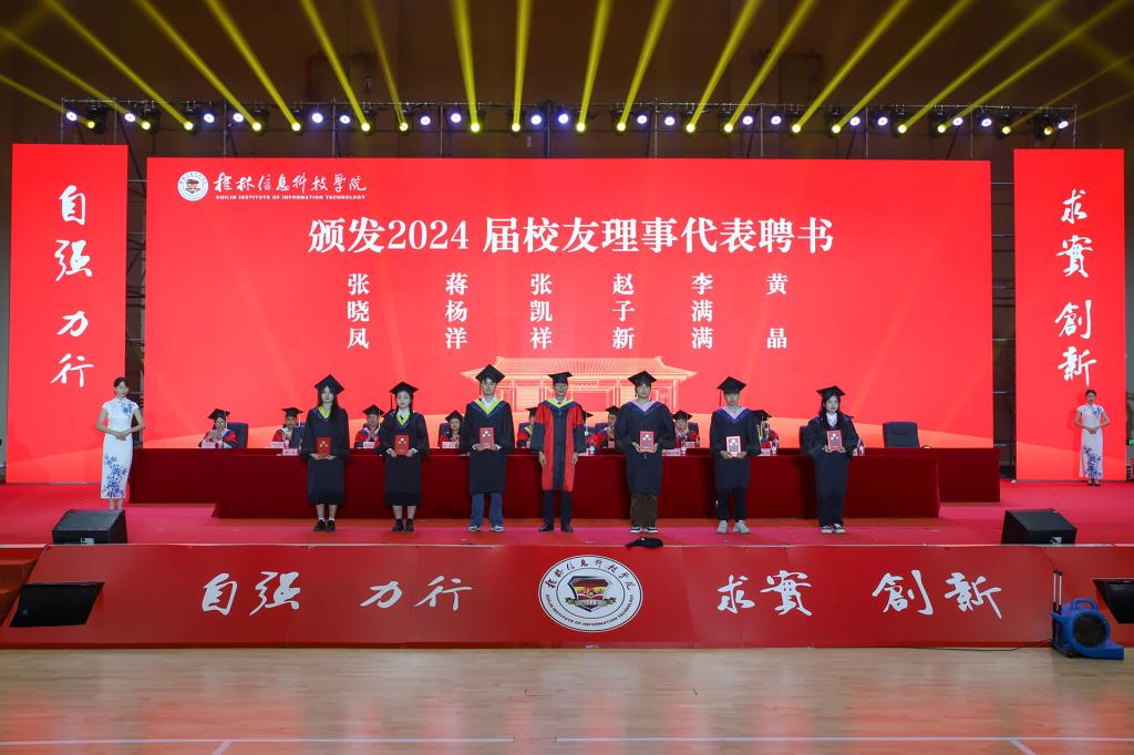 晚上19时,典礼在庄严的国歌声中拉开序幕。副校长刘跃峰宣读2024届广西区优秀毕业生、学校优秀毕业生及毕业生干部表彰决定。董事长罗欣、校长解庆林、副校长刘跃峰分别为2024届广西区优秀毕业生、学校优秀毕业生、学校优秀毕业生干部颁发了荣誉证书。党委副书记、纪委书记李飞宣读了关于聘任beat365官方网站2024届校友理事代表的决定,副校长刘跃峰颁发2024届校友理事聘书。