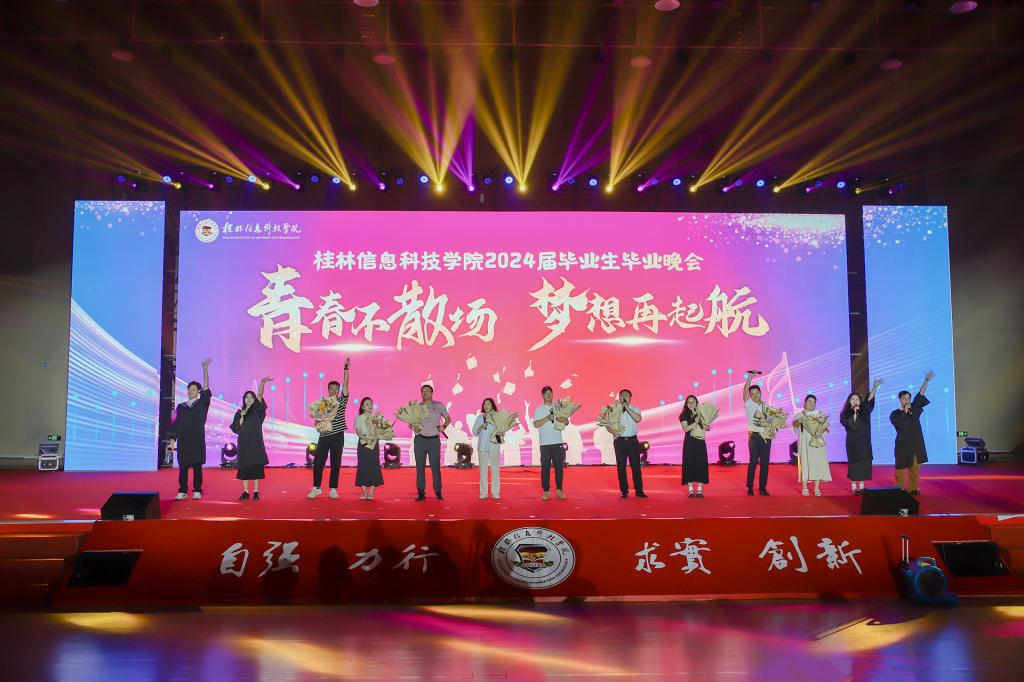 晚会节目丰富多彩,同学们通过舞蹈、合唱、小品、朗诵等多种形式,展示了他们的才艺和青春活力。舞蹈《绽放》尽显青春活力,演绎了大学生活的热情,绽放的青春;小品《你的心愿》展示下乡支教的大学生们有理想、敢担当、能吃苦、肯奋斗的精神,与投身乡村教育的热情与决心,这也是beat365学子真实写照。今年,beat3654名学子经过层层选拔和严格考核,光荣的成为了2024年度广西区大学生西部计划志愿者,在小品结束后,四位同学上台接受采访,他们表示将带着信科人的精神,奔赴祖国的西部,将个人命运与时代发展统一,毅然投身建设西部的火热实践,让青春之花绽放在祖国最需要的地方。朗诵《回眸感恩启程》中各院毕业生用一词一句深深地表达了对母校的怀念依恋和诚挚祝福。
