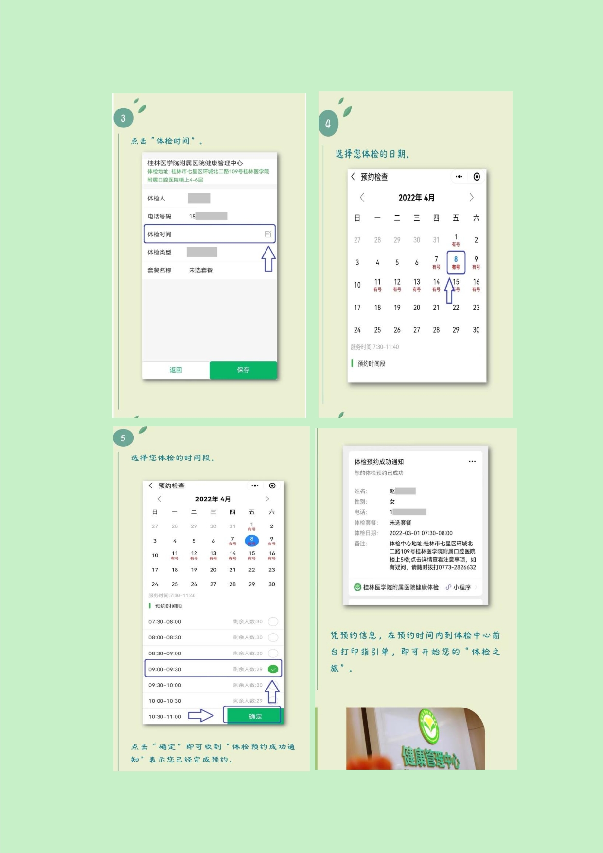 七、因故未能按时参加体检的教职工,可在10月28日前自行线上预约(预约流程附后)到桂林医学院附属医院体检中心进行补检,逾期按自动放弃处理。因涉及费用结算,请已领取体检单而未完成或不体检的教职工,在10月28日前把体检单交还到卫生所,谢谢配合!