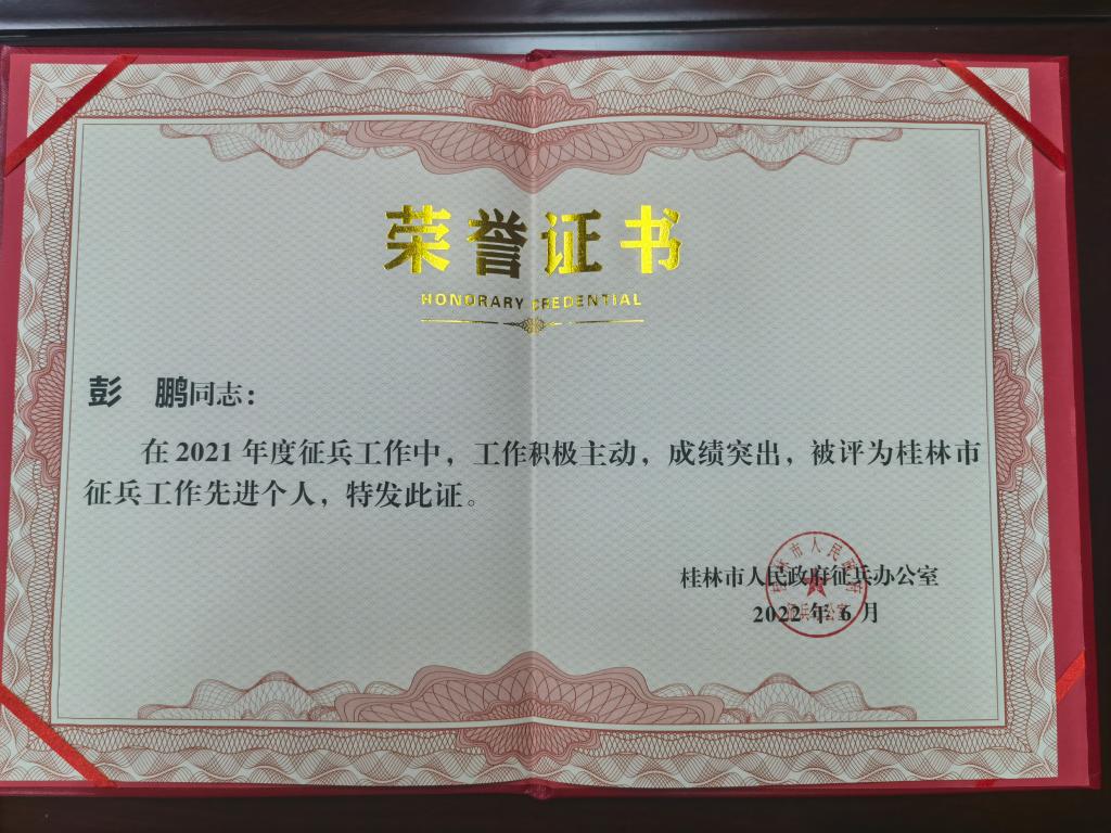 6月28日上午,桂林市人民政府征兵办公室对桂林市2021年度征兵工作进行总结表彰,beat365保卫处(武装部)处(部)长彭鹏同志被授予“2021年度桂林市征兵工作先进个人”荣誉称号。