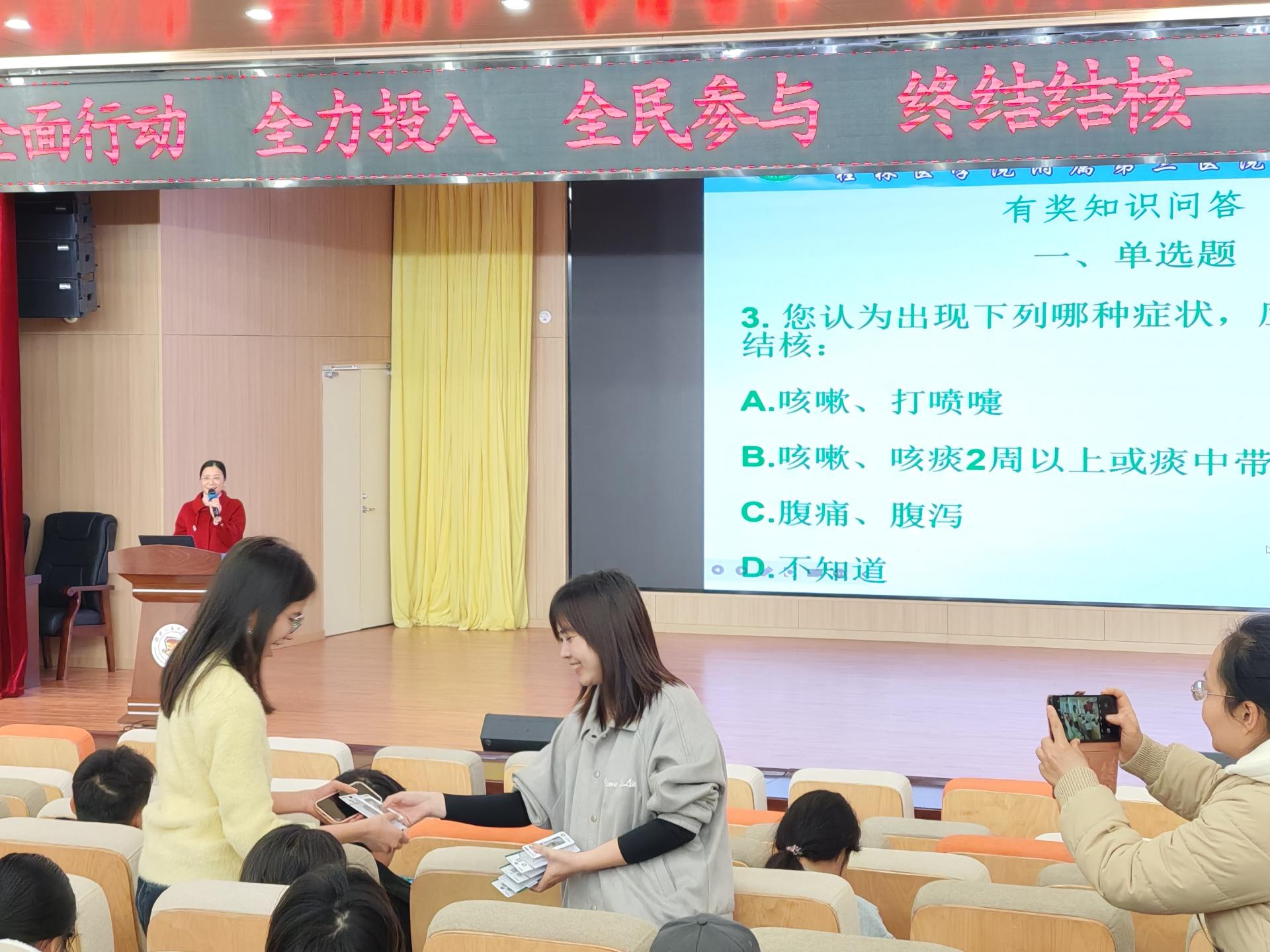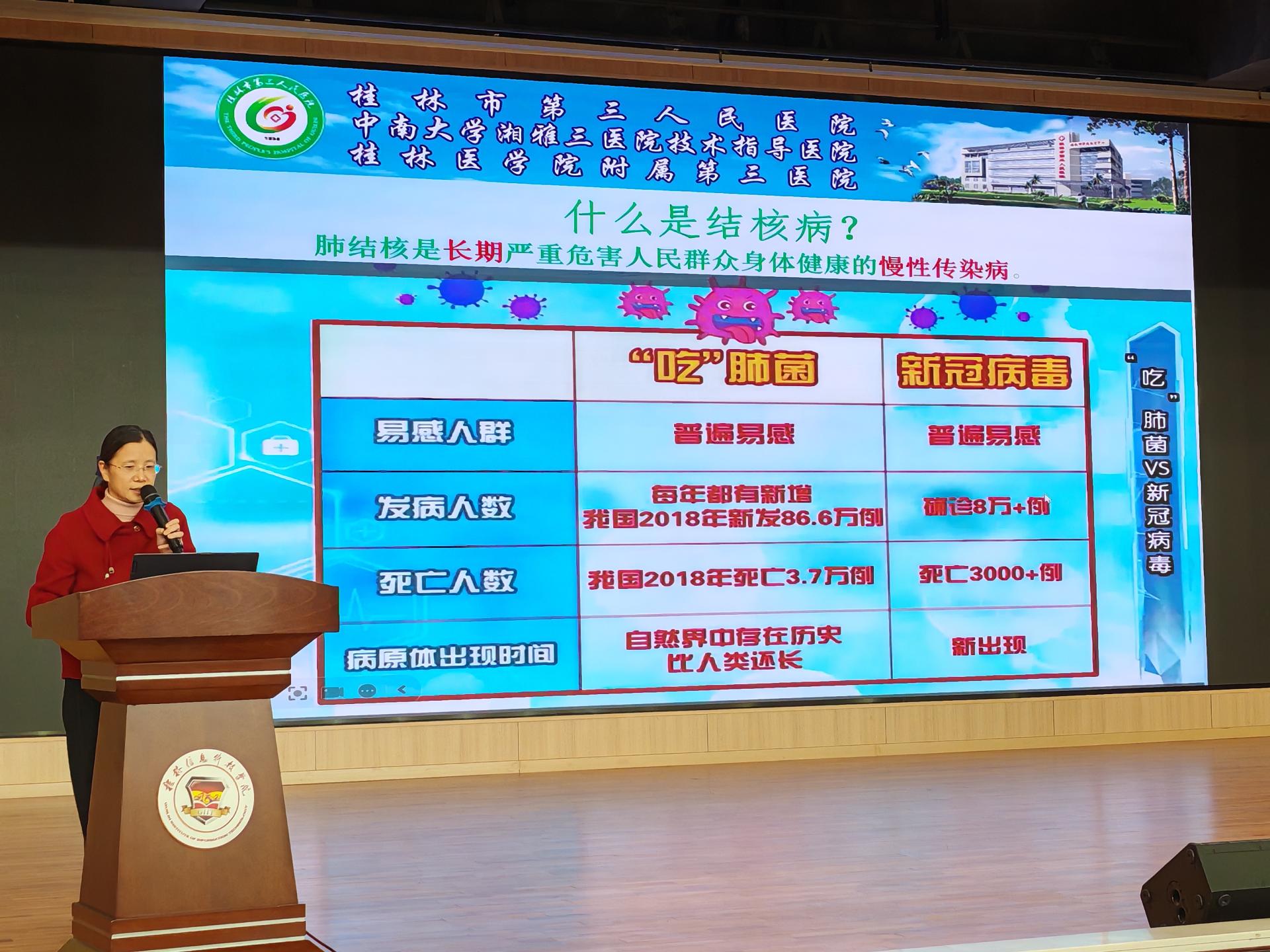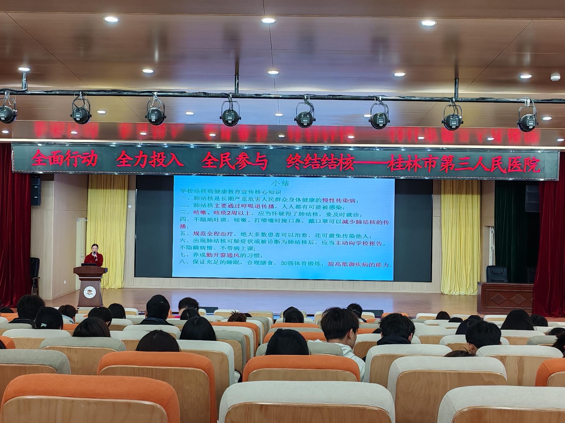 结核病是全球范围单一病因所致死亡率最高的传染病,也是目前严重危害我国人民健康的重要传染病。为了让学生了解肺结核的有关知识,并能科学有效的预防肺结核的发生,保护大家的身体健康,3月19日下午,学校邀请桂林市第三人民医院副主任医师,预防保健科副科长陈要燕到校开展主题为“终结结核,全民参与、全力投入、全面行动”讲座,400余名学生代表参加。