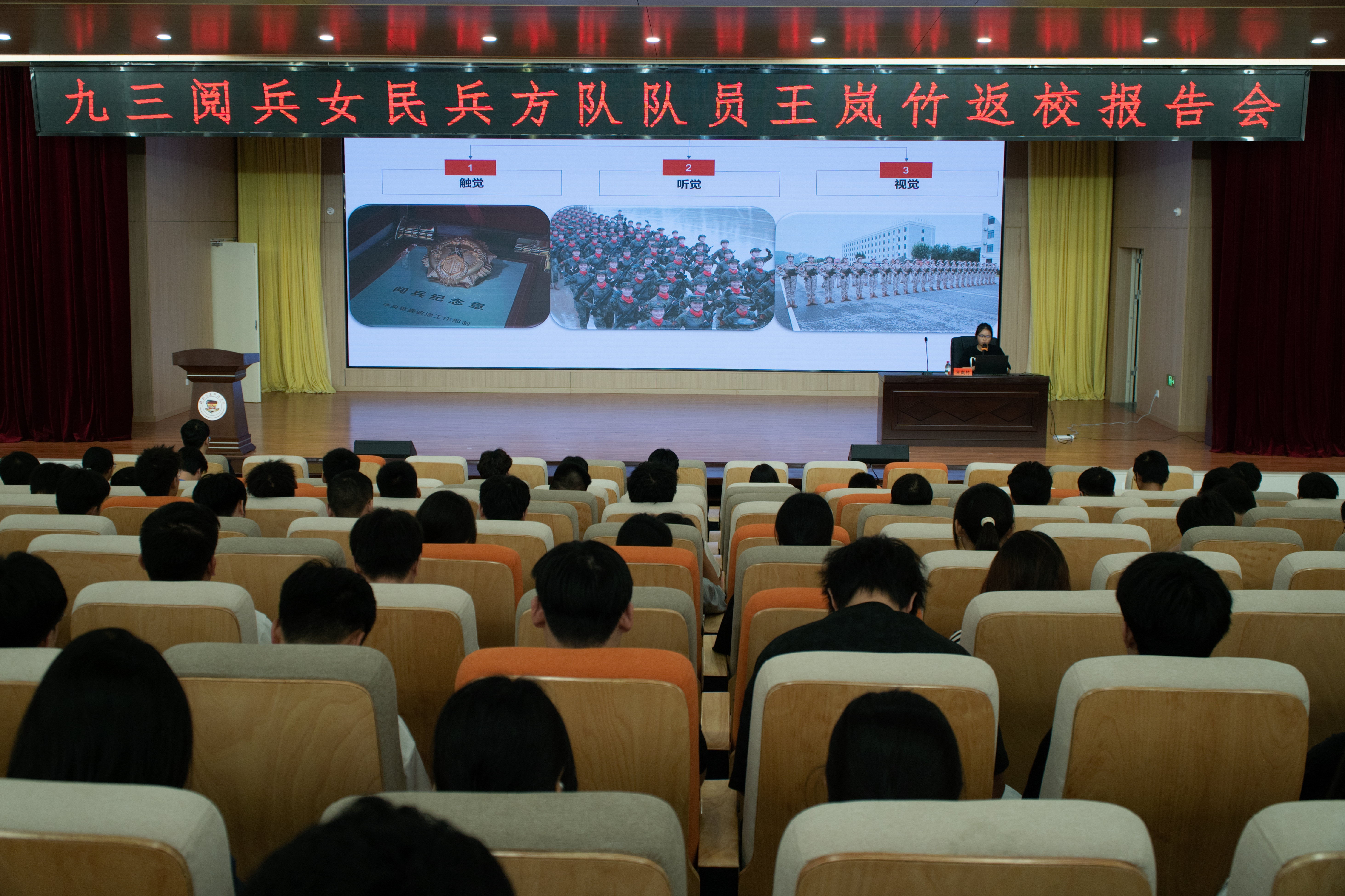 10月13日,beat365在博文楼F107报告厅举办九三阅兵女民兵方队队员王岚竹返校报告会。本次报告会由参与阅兵的王岚竹担任主讲人,全校300余名师生现场聆听,共同感受中国女民兵的热血担当与精神力量,接受了一场深刻的爱国主义教育与理想信念洗礼。