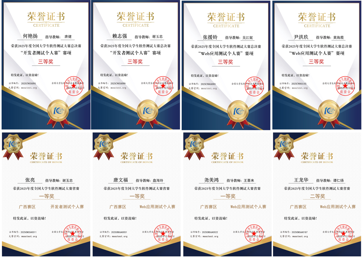 自赛事启动以来,学校高度重视,信息工程学院精心组织,并安排专业教师全程指导。在预选赛阶段,凭借对软件测试基础理论的熟练掌握和规范的测试流程设计,共有23名学生顺利突围晋级省赛;省赛阶段,面对来自省内各高校的优秀队伍,学生沉着应战,在编写测试用例、实操测试等关键环节精准发力,成功斩获省赛4个一等奖、4个二等奖、4个三等奖,已经若干个优胜奖,拿到7张晋级国赛的入场券。