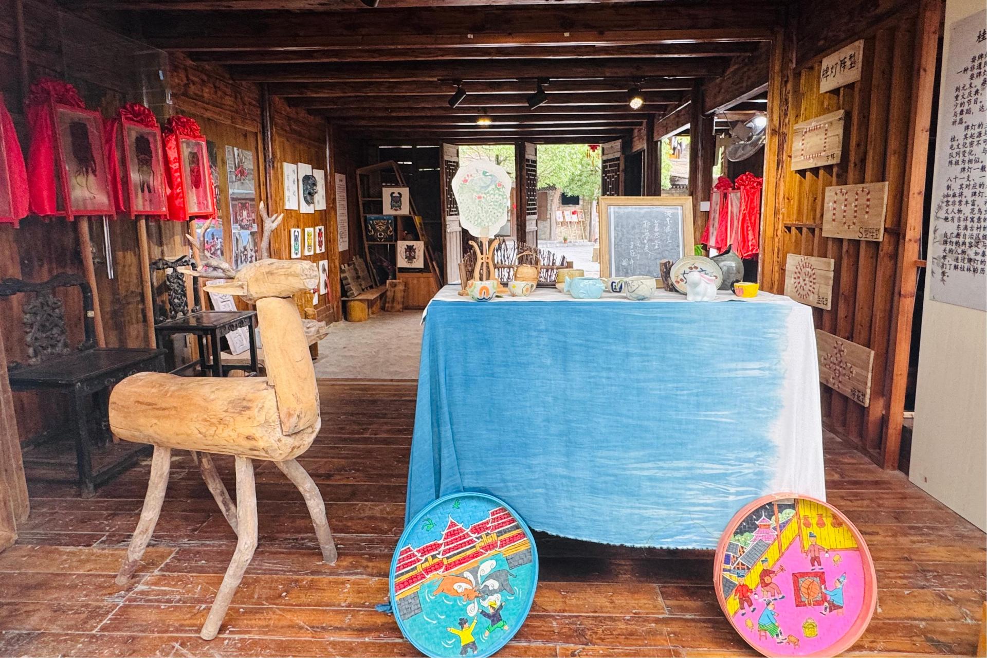 此次展厅布置以展示学生实践成果为核心,旨在搭建一个集创意展示、交流学习、成果转化于一体的综合性平台。自协同育人基地成立以来,创意设计学院各专业学生在东漓古村进行了多次实地考察、采风与创作实践,将课堂所学与传统文化、古村特色、非遗文化深度融合。展厅内陈列的作品涵盖动画IP形象设计、文创、陶瓷、扎染等多个领域,每一件作品都凝聚着学生们的智慧与心血,展现了他们对古村文化的独特理解和非遗文化的创新表达。