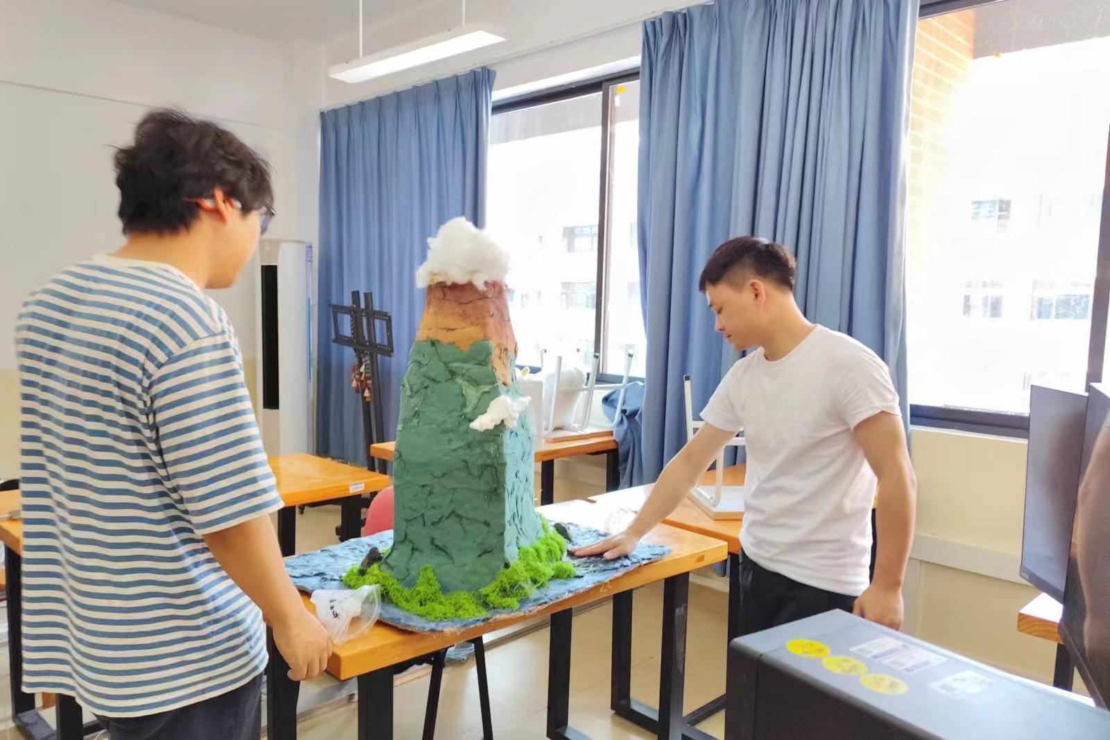 在模型检视环节,教师发现多组作品存在结构稳定性不足、材料运用不恰当、色彩搭配不协调等问题。某小组的还原的火山喷发的场景,虽已搭建出大致框架,但模型细节粗糙,层次单一,超轻黏土塑造的海面效果不佳。针对该问题,霍敏老师亲自示范,在模型上雕琢纹理、调配色彩,一边操作一边讲解技巧:“纹理要顺着海浪的产生方向或使用痕迹来刻画,色彩需根据主题营造氛围。” 在教师的耐心指导下,原本粗糙的模型渐渐焕发生机,细节之处尽显精致。针对其他模型中场景布局混乱、主次不突出的问题,三位教师也逐一进行讲解,指导学生调整纸板搭建的房屋结构,通过色彩对比和高低错落的布局增强表现力。