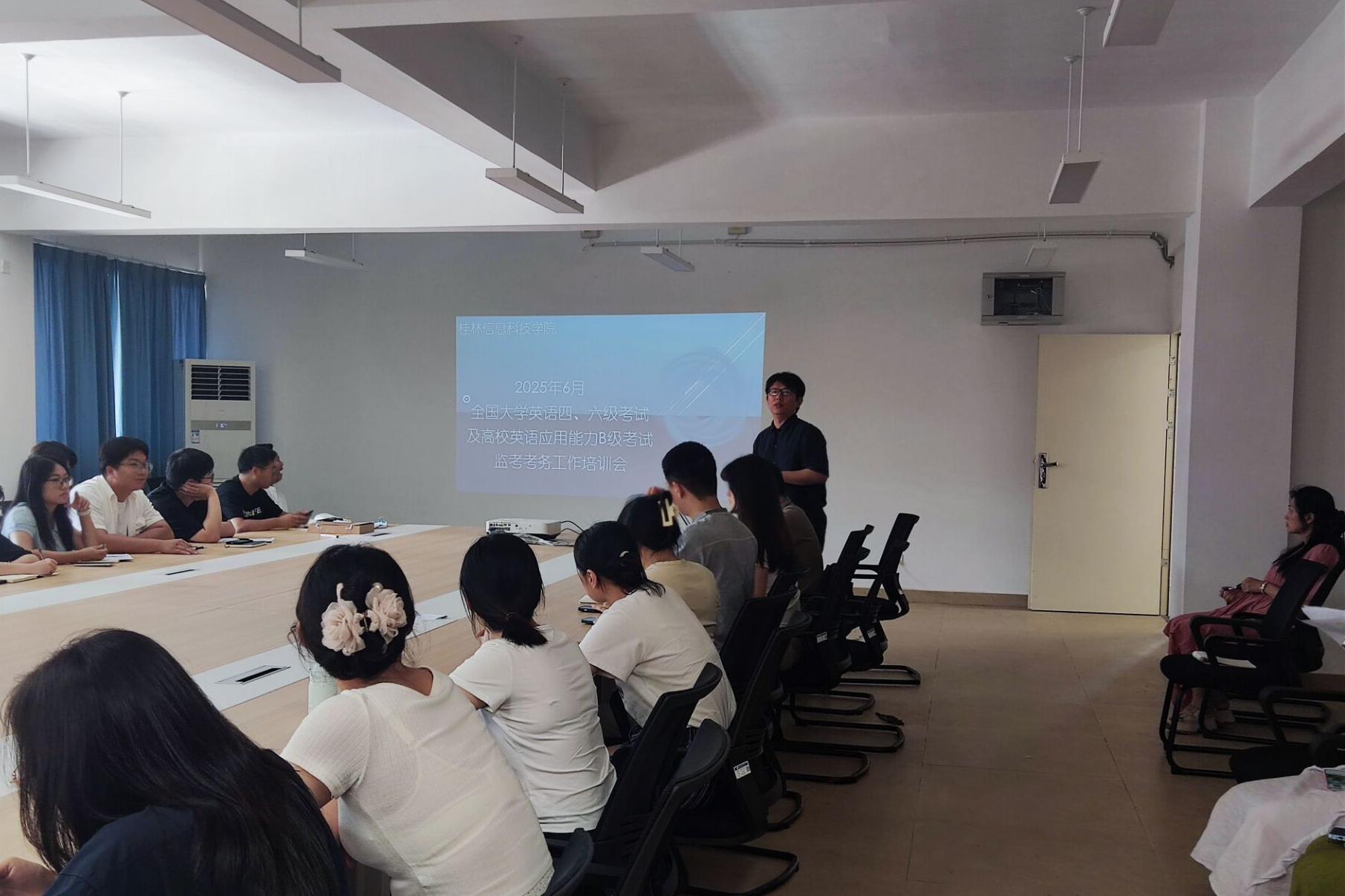 为确保2025年6月全国大学英语四、六级考试规范有序进行,提升监考教师的履职能力,6月13日,创意设计学院在守正楼G501教室召开监考工作专题培训会。会议由学院副院长李辉主持,全体监考教师参加。