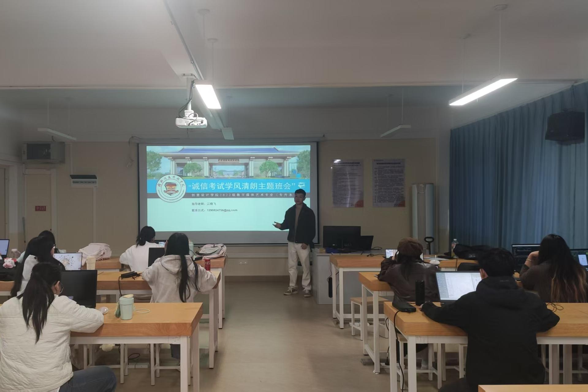 12月2日,2022级数字媒体艺术专升本班级于守正楼G417开展诚信考试学风清朗主题班会,由班主任江晓飞老师主持,全班同学参与。