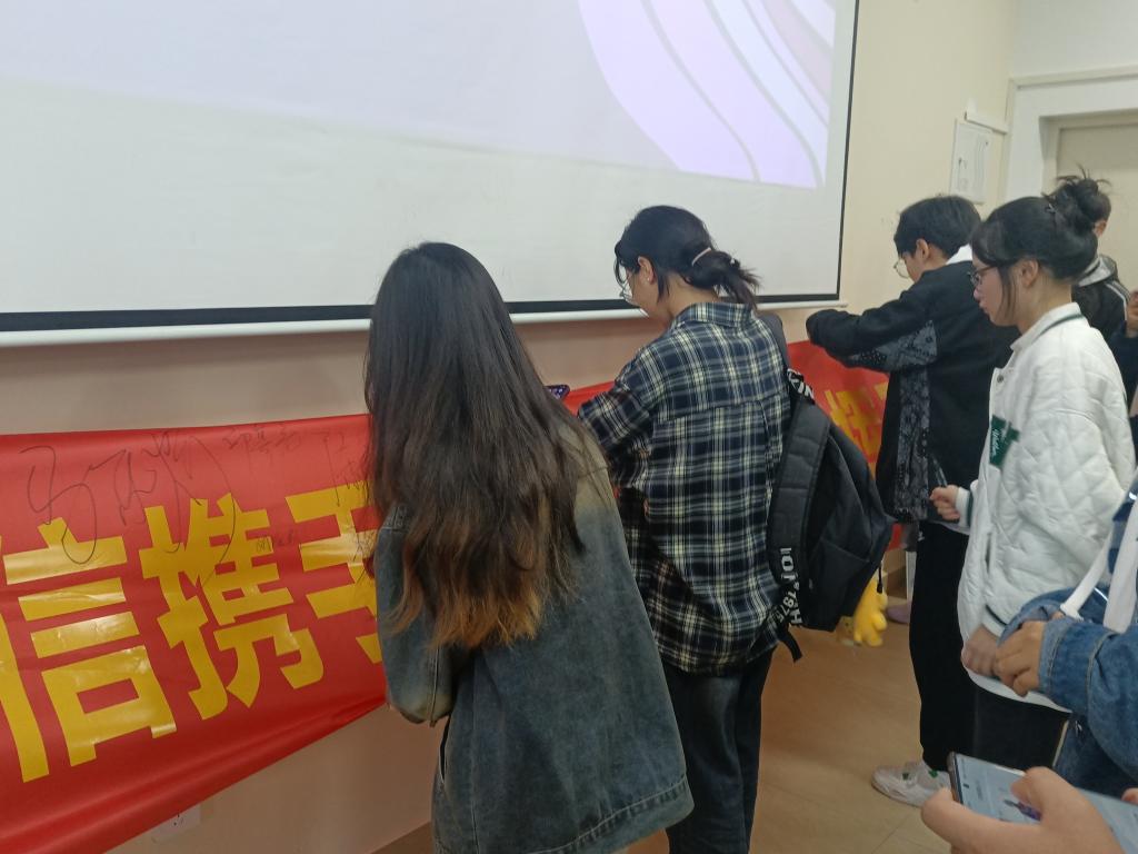 活动伊始,李威老师对参加此次活动的同学强调考风考纪的重要性,并从端正考试态度、严肃考试纪律方面进行了动员,要求同学们严于律己、诚信应考,文明考风,为每一场考试交出合格的诚信答卷,为严肃考风考纪、建设优良学风贡献自己的一份力量。随后工作人员在桌面上铺好横幅,准备好用具后同学们依次排队在条幅上签字。