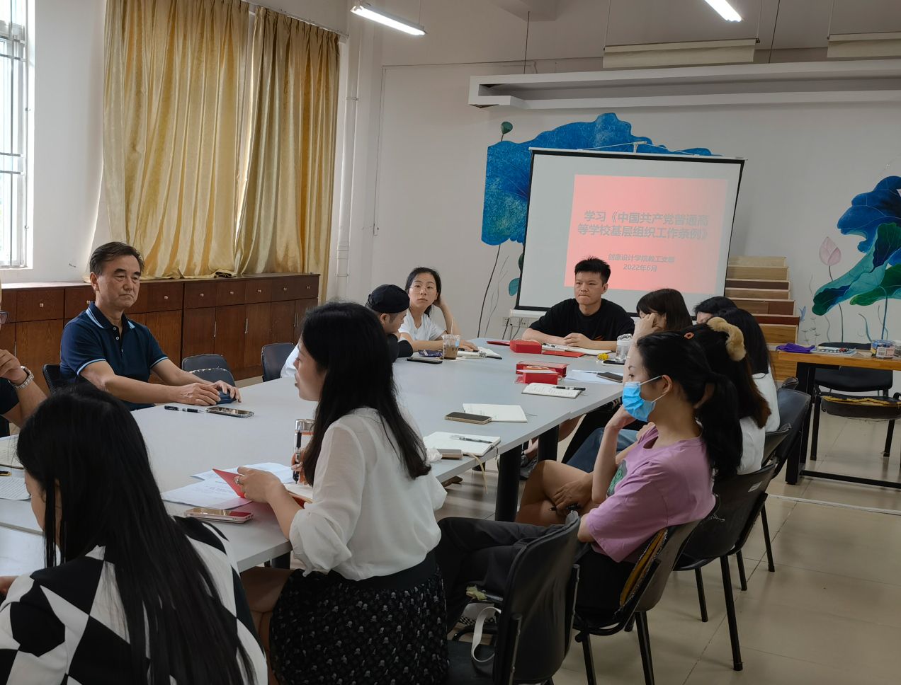 2022年6月10日,创意设计学院教工党支部开展专题学习《中国共产党普通高等学校基层组织工作条例》,活动由教工党支部书记田婧主持,支部全体教工党员参加。