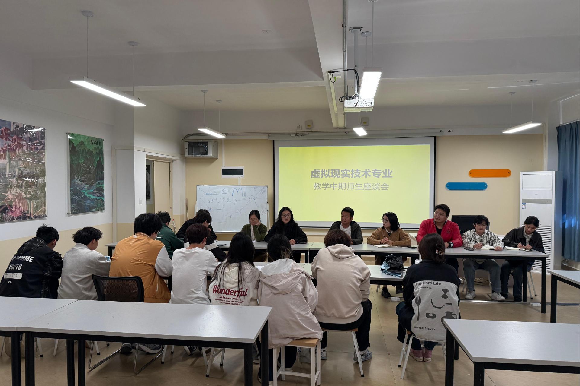 为梳理本学期中期教学工作,保障教学质量,并系统规划下一阶段专业建设重点,虚拟现实技术教研室于2025年11月14日在行政楼716组织召开了本专业中期教师座谈会。教研室全体教师参会,会议由教研室主任韩笑老师主持。会议围绕教学中期检查汇报、下学期课程安排及教研室专项工作等核心议题进行了深入研讨与部署。会议首先对本学期第一至十周的教学工作进行了复盘与总结。各任课教师就教学进度、课堂效果、学生学风以及实践环节等方...