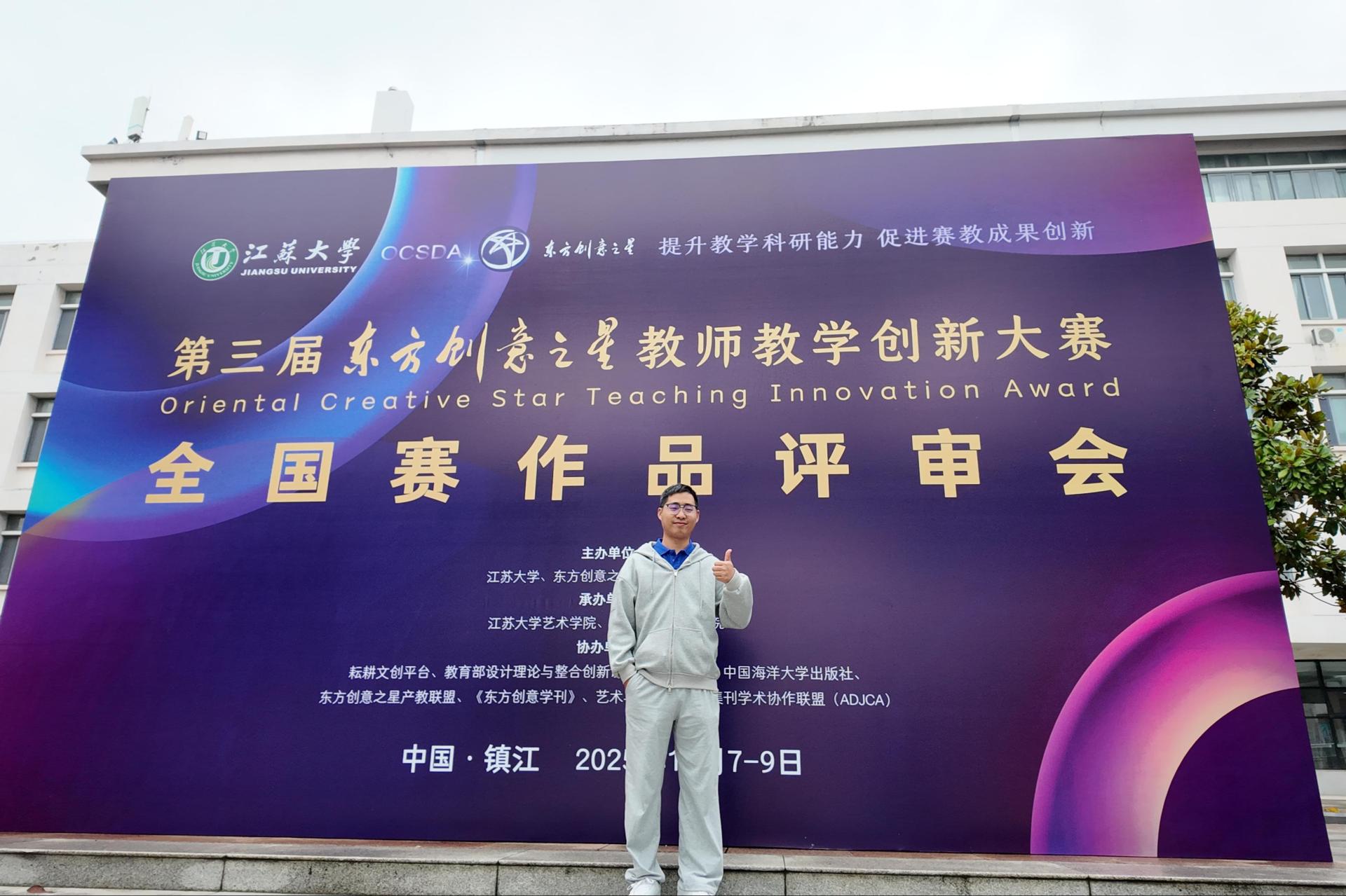 11月9日,第三届东方创意之星教师教学创新大赛全国作品评审会在江苏大学圆满落幕。创意设计学院徐祥伍老师凭借扎实的教学创新成果与精彩答辩,从全国众多参赛者中脱颖而出,斩获国家级金奖,为学校赢得荣誉。徐祥伍老师参加线下答辩,围绕《溯源与推演——非遗灰塑在现代茶室空间中的设计应用》的创新理念、非遗元素与现代设计的融合实践路径及成果转化等内容展开阐述。其内容将非遗传承与现代空间设计教学深度结合,兼具创新性...