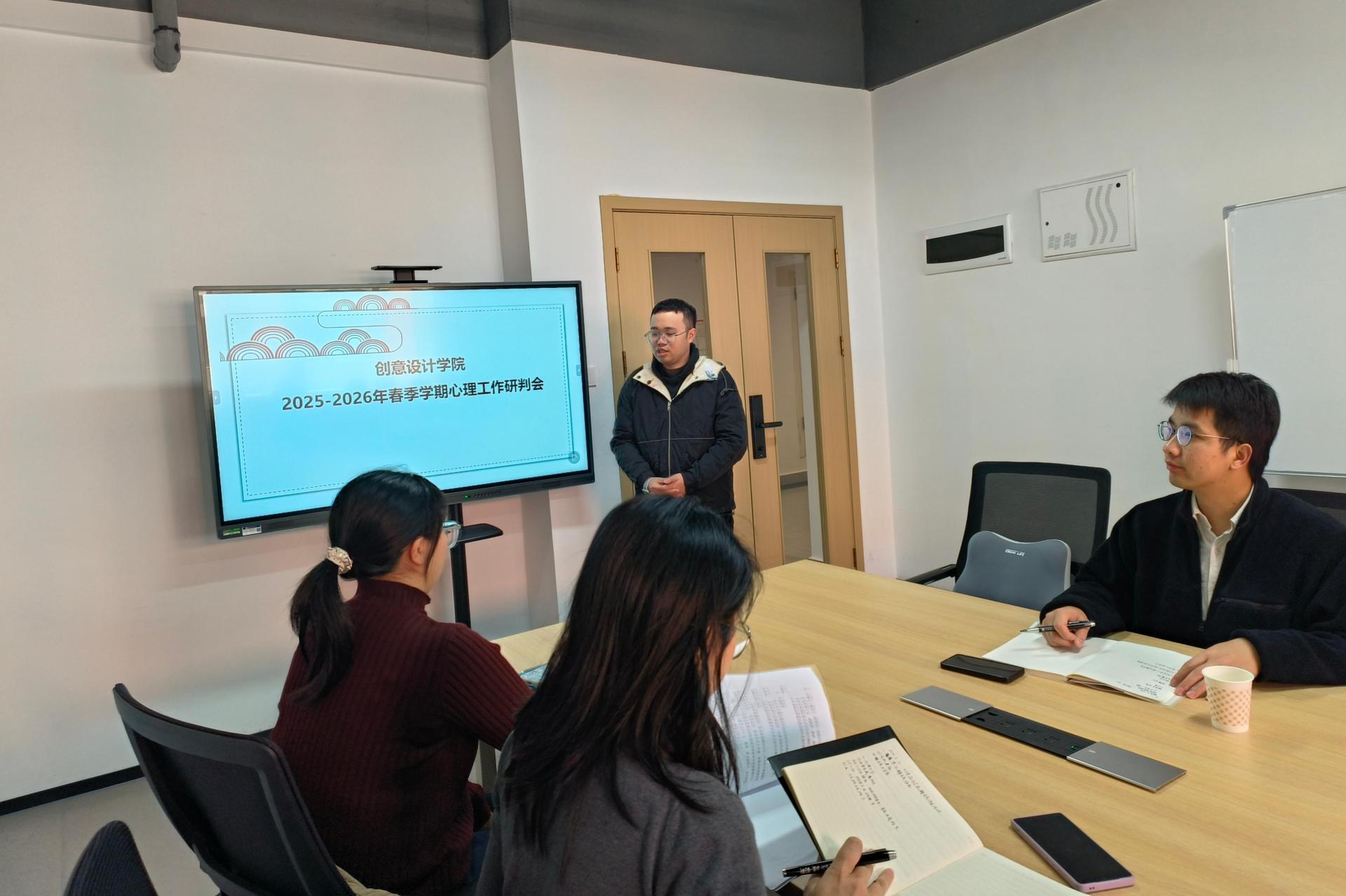 为切实维护校园安全稳定大局,全方位保障学生身心健康成长,创意设计学院扎实推进心理健康保障工作,于3月19日圆满完成2026年春季学期学生心理健康普测,并于3月25日在知行楼教师工作坊716会议室召开心理研判专题会议,精准部署后续心理帮扶举措。本次心理研判会议,心理辅导员陈胜明老师率先对本次心理健康普测的整体推进情况、数据分布特征及结果进行了全面细致的阐述,为后续研讨提供了扎实的数据支撑。随后,刘珊珊副书记在...