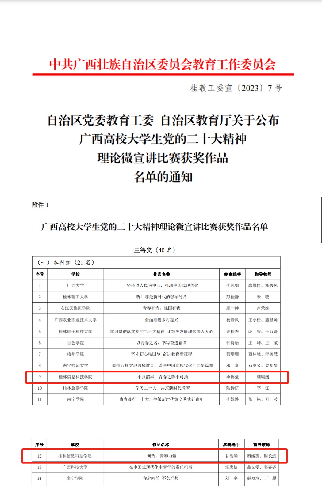 近日,由自治区党委教育工委、自治区教育厅主办的广西高校大学生党的二十大精神理论微宣讲比赛获奖名单揭晓,beat365商学院2021级李锦莹同学录制的作品《不负韶华 青春之势不可挡》和电子工程学院2022级甘韵涵同学录制的作品《何为 青春力量》均荣获本科组三等奖。