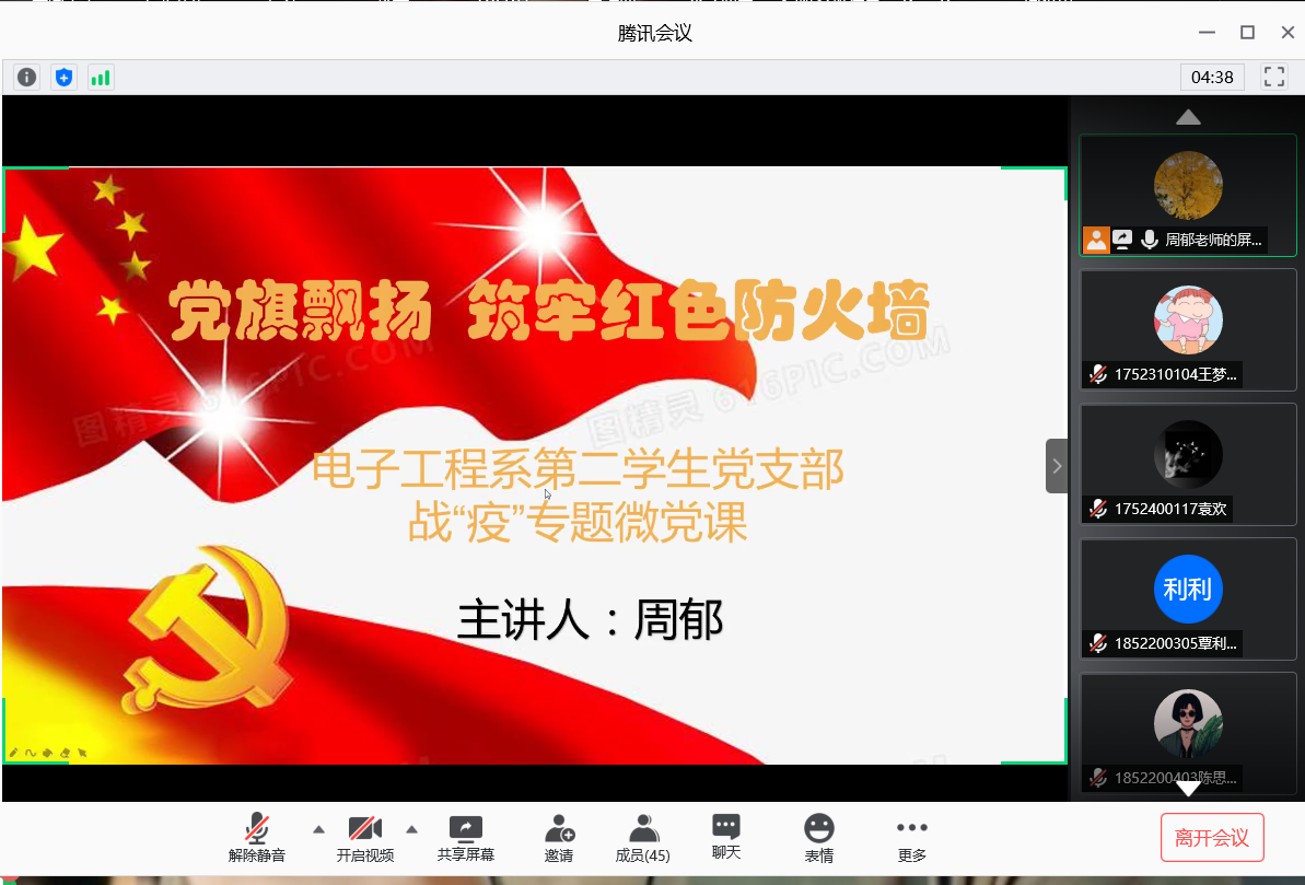 为贯彻落实学院关于在常态化疫情防控中加强基层党建“四个一”行动方案的实施,6月29日晚,电子工程系第二学生党支部开展“党旗飘扬、筑牢红色防火墙”——战“疫”专题线上微党课,由党支部书记周郁主讲,支部全体党员参加。