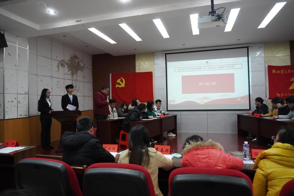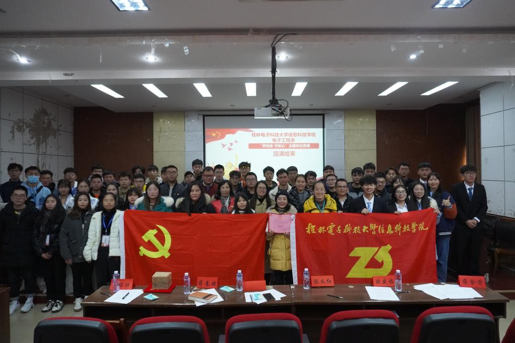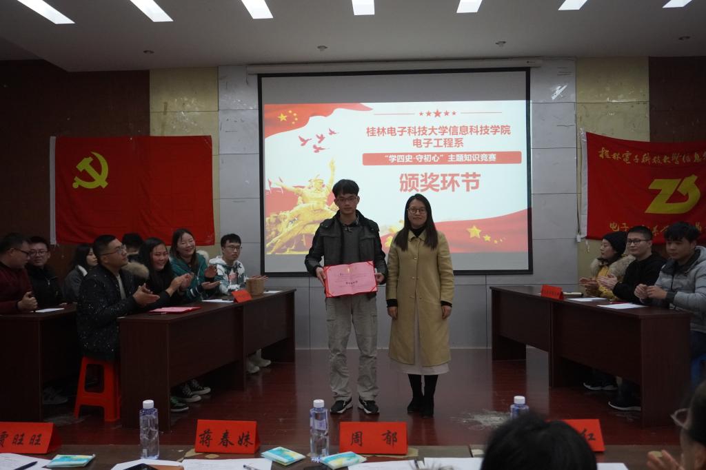 为加强学生党员思想理论建设、加深对四史的了解与学习,12月4日中午,电子工程系党员先锋队在21201报告厅举办“学四史,守初心”主题知识竞赛。学院党群事务部老师蒋春妹,系专职组织员陈义红,先锋队指导老师池锴及各学生党支部书记出席活动。
