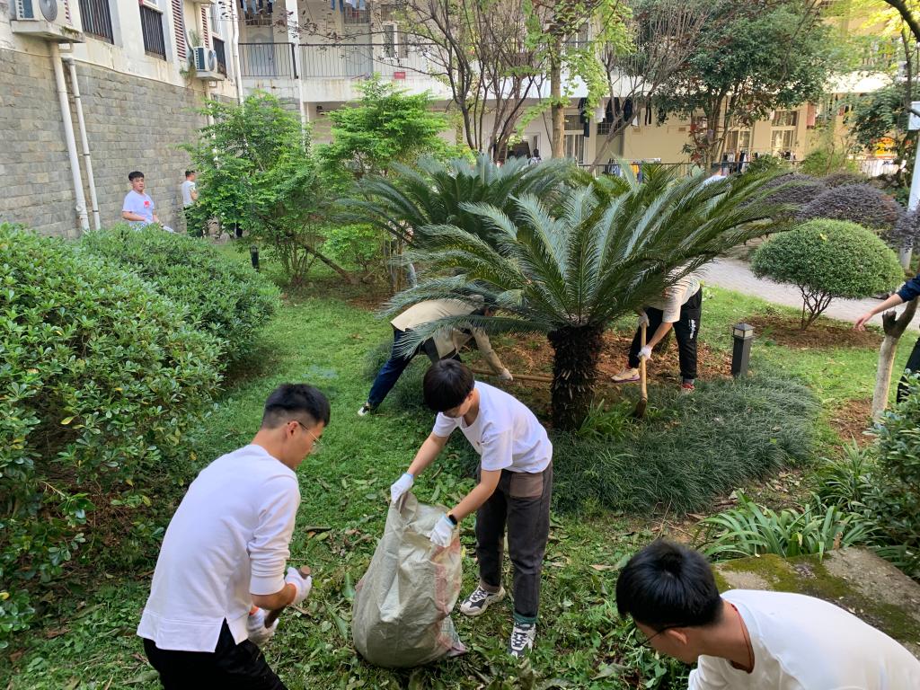 11月11日12日中午。电子工程系第二三、第一学生党支部分别组织开展志愿服务活动,在后勤物业中心老师的带领下,对三号公寓绿化带、五教篮球场进行除草施肥、清捡石头。