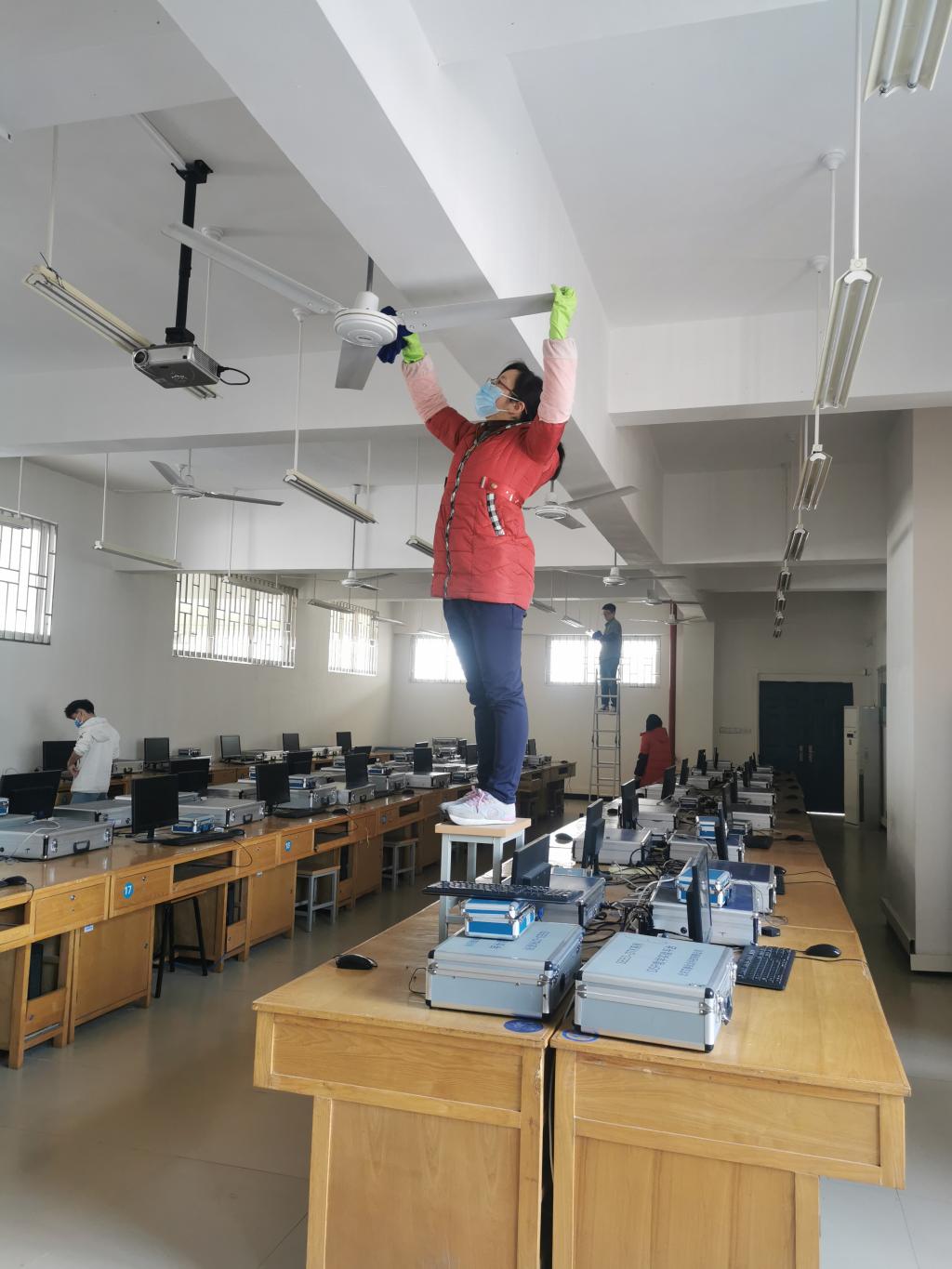 活动中,老师们分成15个小组分别对42306、42307、51106、51103等15间实验室进行清扫。大家本着不怕脏、不怕累的精神,纷纷拿起抹布、扫帚等清洁工具对各实验室的风扇、柜体、地面、桌面、墙角等进行了全面彻底的清理和打扫,经过三个多小时的努力,实验室焕然一新。