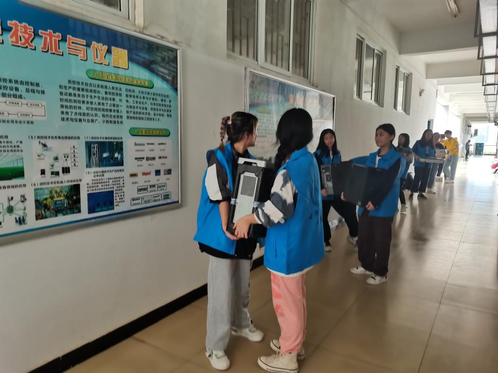 活动中,同学们经过简单分工,对数量多、重量轻的实验器材以接龙的形式进行搬运,对于较重器材,同学们三人一组,相互配合对器材进行搬运,并对杂乱的实验器件进行归纳整理,使原本杂乱无章的实验室变得干净整洁,焕然一新。