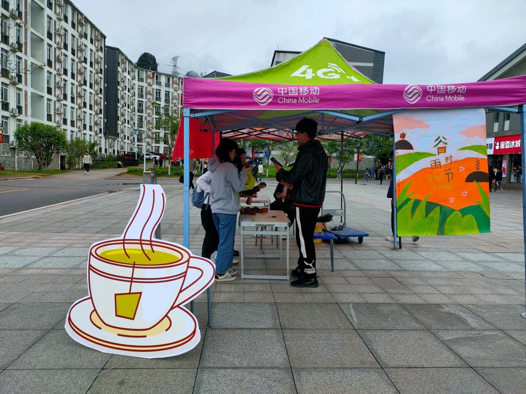 此次活动分为外场与内场两个阶段。外场阶段,同学们通过QQ、微信等媒体平台,撰写并转发关于“谷雨”节气的相关文案进行宣传推广,同学们可凭截图在二号食堂门口领取茶包礼品。内场阶段,同学们在茶室观看节气介绍视频,进行相关知识抢答,并通过闻茶品茗、欣赏茶道表演,感受节气背后的文化内涵。