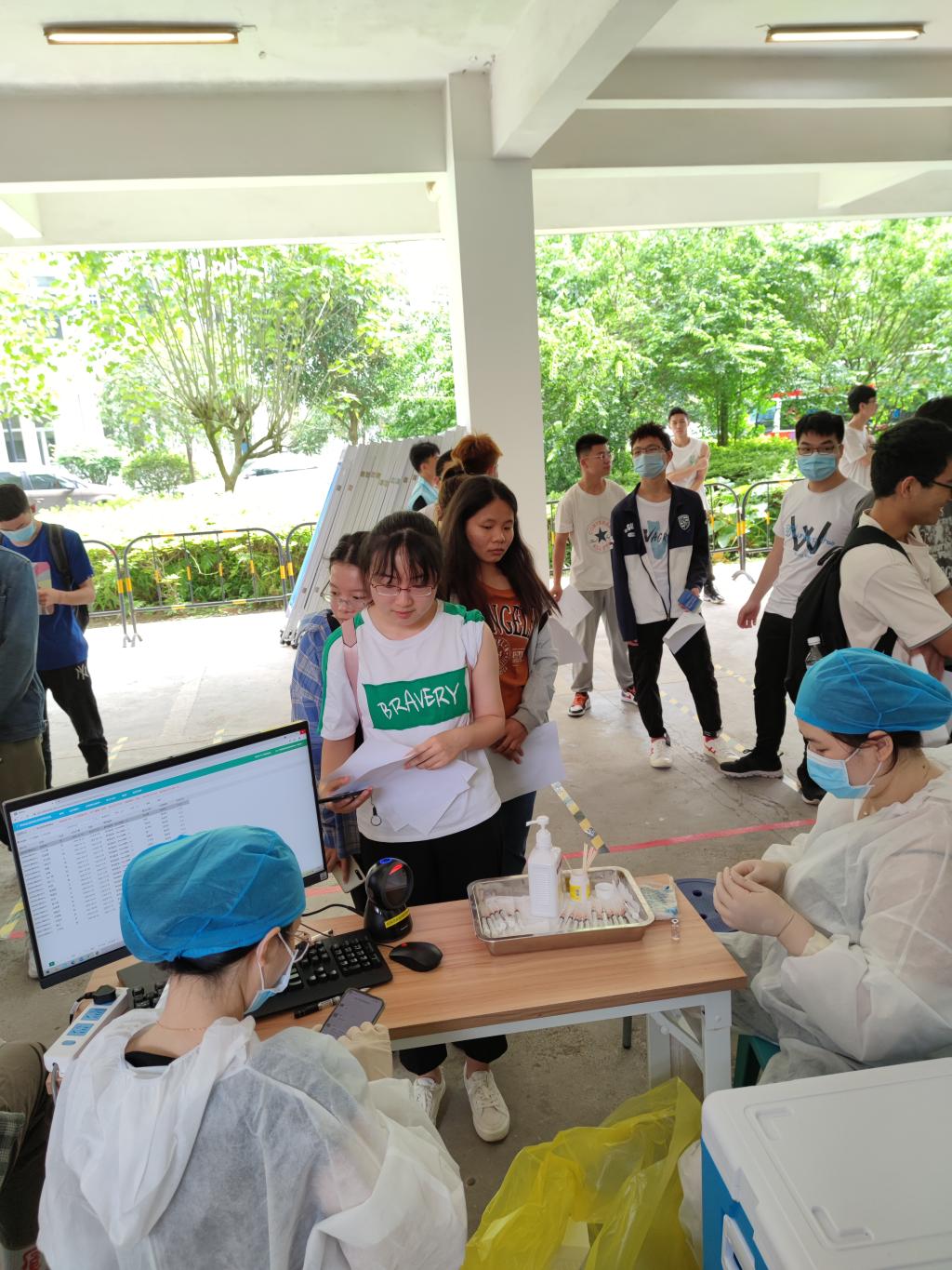 接种新冠疫苗,共筑免疫长城。电子工程系按照学院接种工作方案,由系党总支书记庄璧瑛带队,系分工会主席和各年级辅导员组织师生于5月24日、25日两天分别前往我院临时接种点三教一区空地,按照接种程序集体进行了新冠肺炎疫苗第一针的接种。