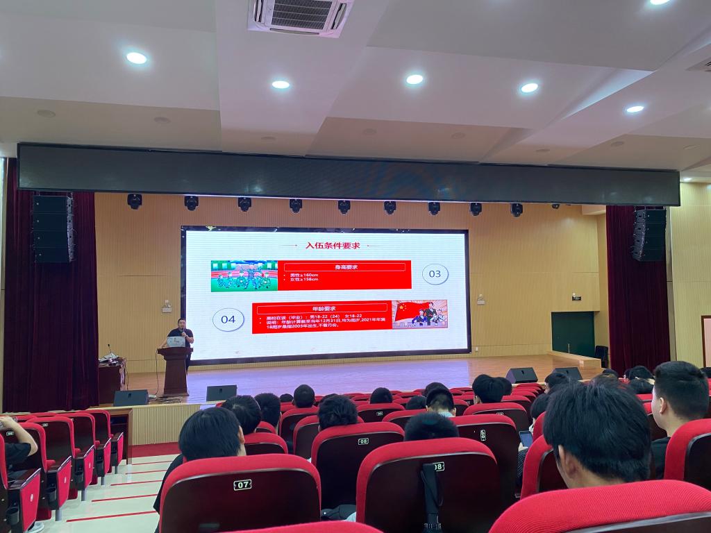 会上,刘老师结合国家2021年征兵入伍的工作内容及毕业生个人发展规划,从征兵的范围条件、入伍的基本身体条件、征兵程序安排、报名方式、入伍的意义等方面为同学们进行了详细解读,着重介绍高校大学生应征入伍优惠政策,充分调动同学们报名应征的积极性,实现征兵、就业工作两促进。