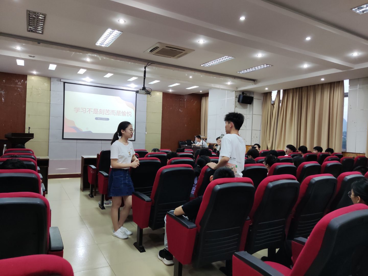 会上,宋超、陈思宇结合自身经验,利用PPT向同学们展示自己的学习方法和学习规划。两位学长学姐建议同学们要尝试读不同的书,不要受领域和学科的限制。在会议最后的提问环节中,有同学提问如何在学习和学生工作间找到平衡,陈思宇同学对此问题进行了详细回复。她首先强调了学习的重要性,希望学弟学妹们重视学习,珍惜大学时光。同时要积极参加学生工作,锻炼意志,接触更多优秀的同学。在场的同学们纷纷表示本次活动很有意义和作用,为大家指明了今后的学习方向。