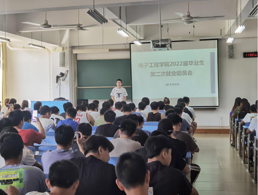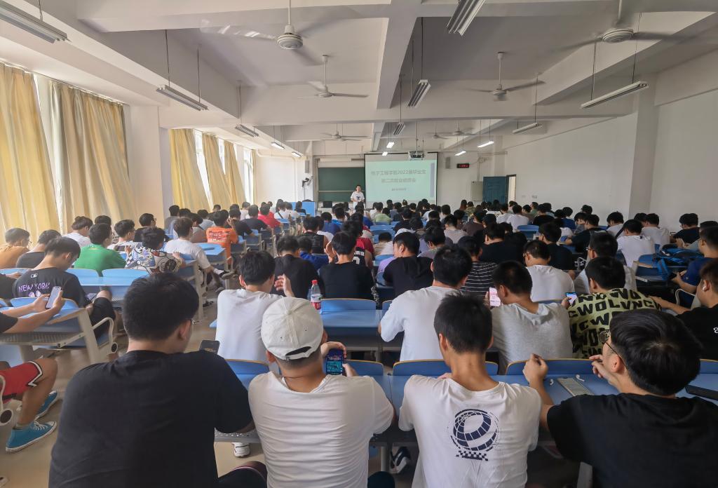 10月4日,电子工程学院在32307教室召开2022届毕业生第二次就业动员会议。本次大会由毕业班辅导员池锴、周郁主讲,2018级全体在校生参加会议。