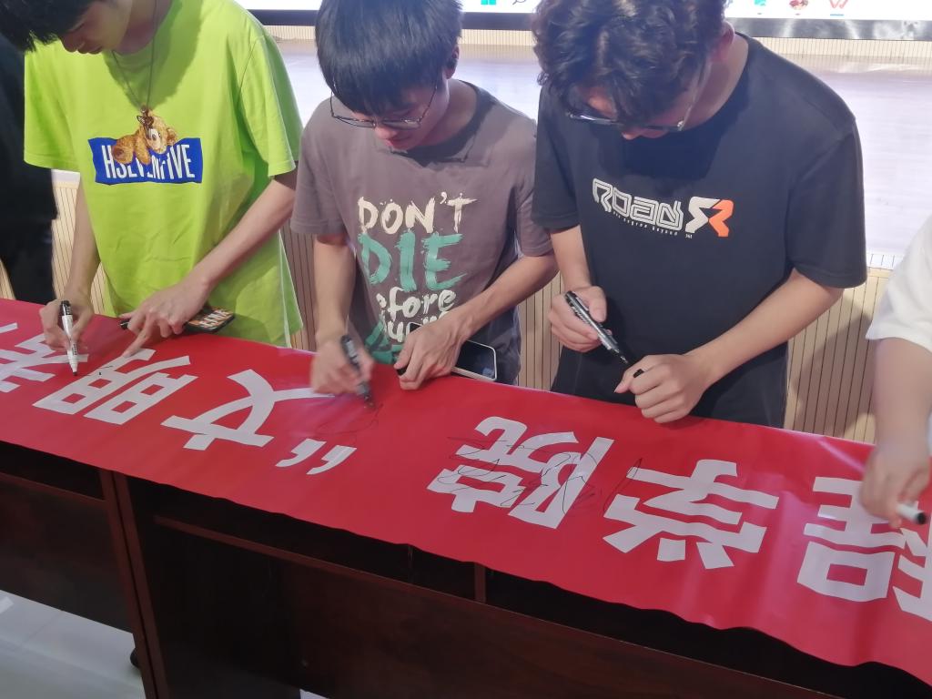 讲座上,朱济亨老师向同学们讲解作弊的危害,通过观看相关视频案例的方式,向同学们进行了详细的说明,告诫同学们要诚信考试,强调考试作弊带来的不良后果。最后,工作人员组织各班学生代表在诚信考试主题横幅上进行签字。