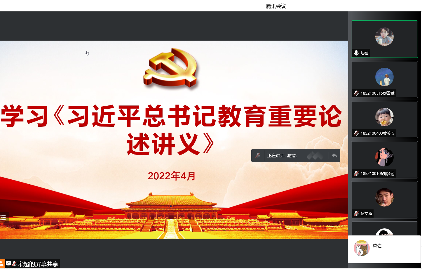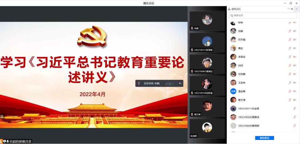 为深入学习贯彻习近平新时代中国特色社会主义思想,4月27日,电子工程学院第一学生党支部通过腾讯会议室,线上组织学习了《习近平总书记教育重要论述讲义》,本次学习会由第一学生党支部书记池锴领学,支部全体党员参加会议。