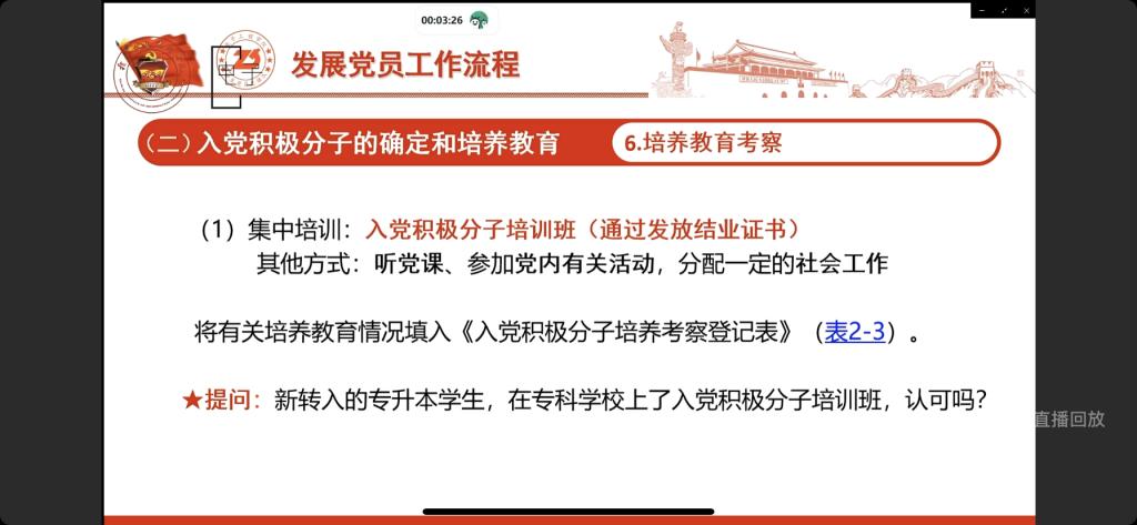 会上,陈老师从申请入党、入党积极分子的确定和培养教育、发展对象的确定和考察、预备党员的教育和转正几个阶段进行详细讲解;陈老师强调群众基础贯彻着党员发展的全过程,日常多为群众办实事,将党的宗旨贯彻在日常行动中。