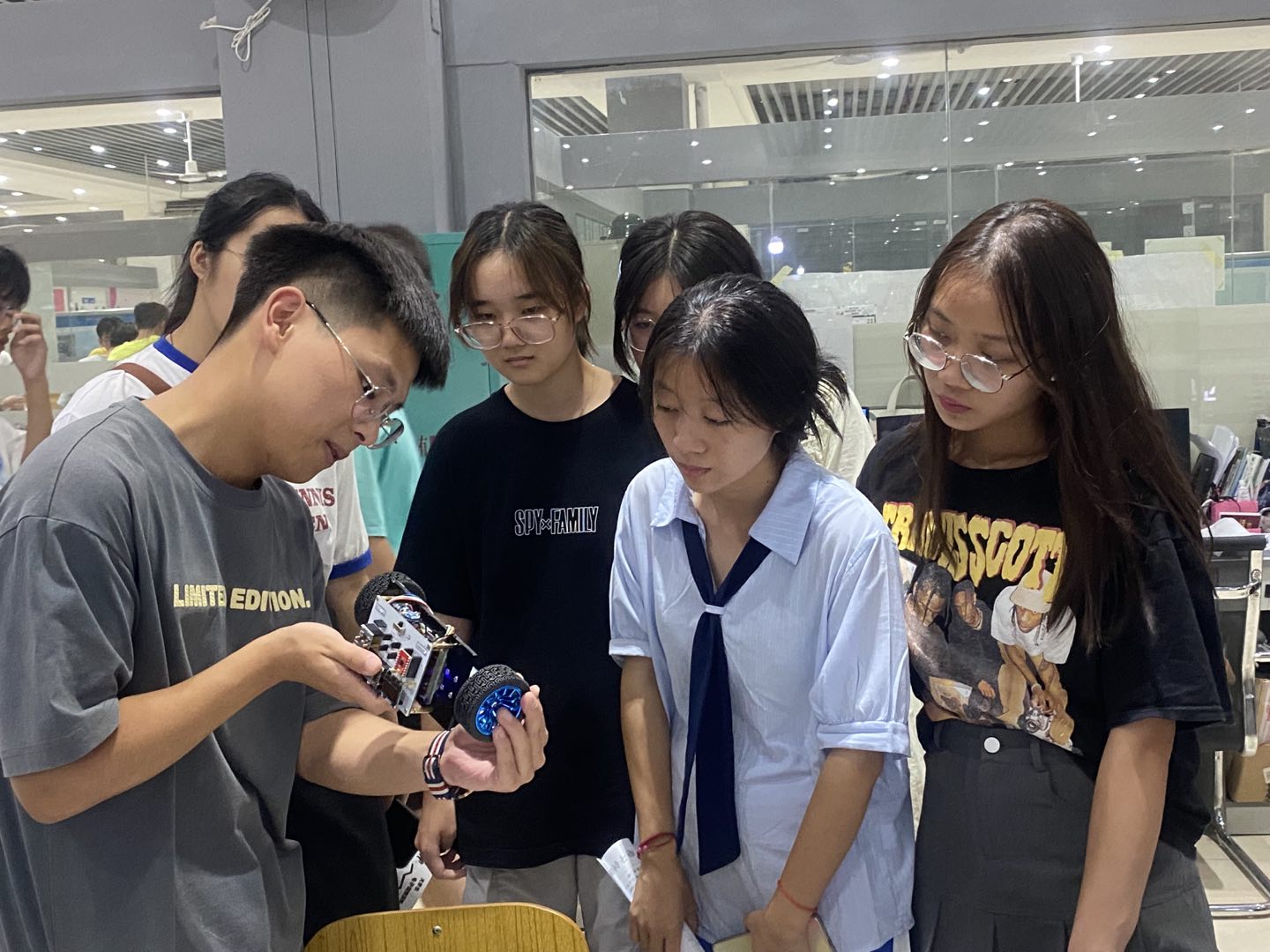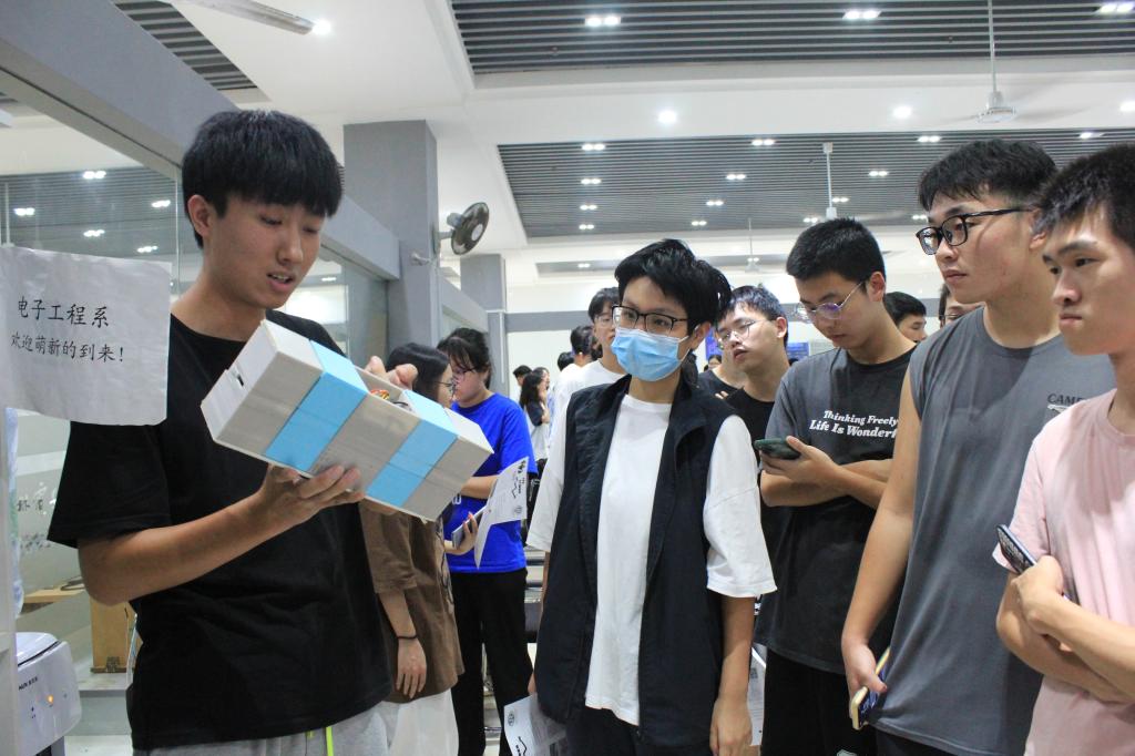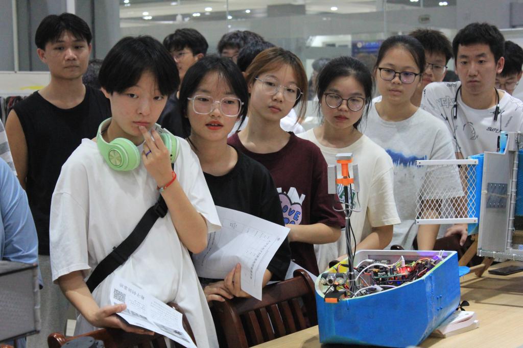 在电子创新基地负责人的引导下,同学们先后参观了创新创业教育成果展示区、创新创业实训室,聆听了学长学姐们的经验分享。在现场演示环节中,机甲战队的学长们邀请新生进行现场操控体验。在他们的耐心指导下,同学们都开始不再拘束,全身心投入到科技创新带来的乐趣中。