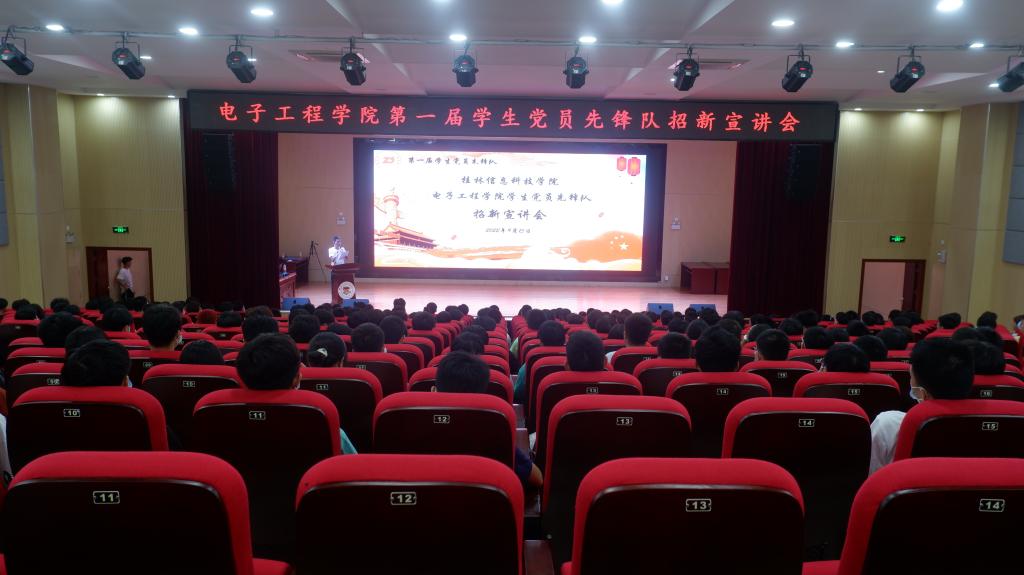 2022年9月15日晚上,电子工程学院学生党员先锋队于51206报告厅举行招新宣讲会,会议由党员先锋队指导老师池锴主持,队长朱峻缘、副队长欧小玲主讲,电子工程学院2022级全体新生参加会议。