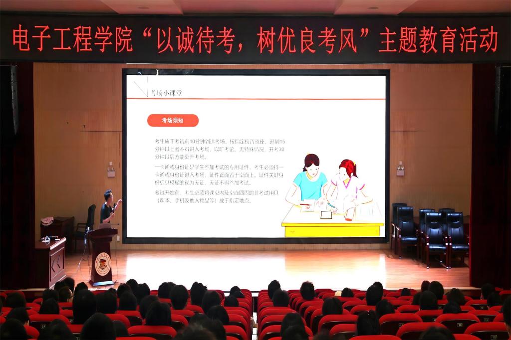 6月8日晚上,电子工程学院在51206报告厅召开“以诚待考,树优良考风”主题教育会议,会议由我院2022级辅导员彭博涛主持,2022级各专业学生参加会议。