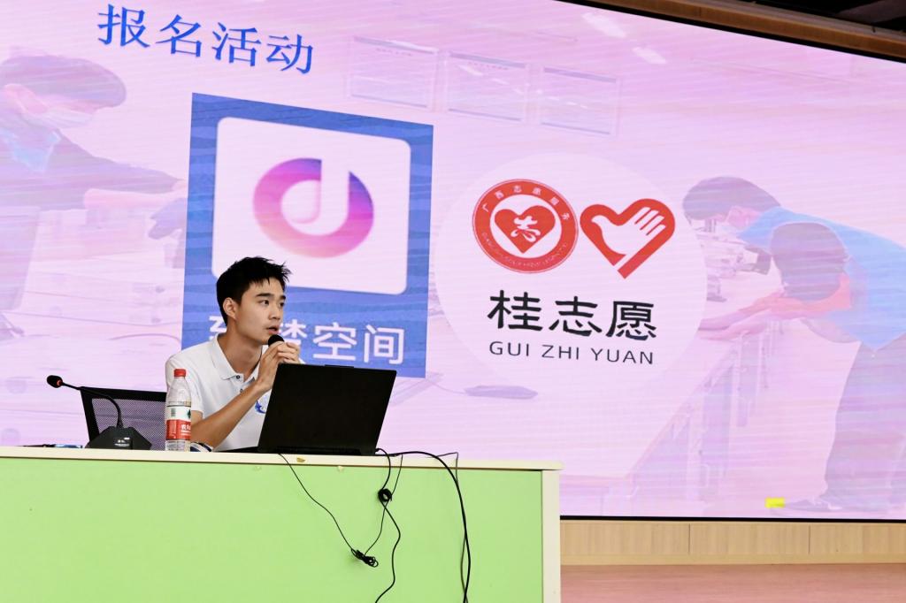 分享会围绕“蓝色青风”、“桂志愿操作讲解”、“青年之声”、“暑期三下乡主题社会实践”四个主题进行。在分享会上,四位分享者分别讲述了他们在各自志愿服务岗位上“苦”与“乐”以及在志愿服务中遇到的难题以及探索解决问题的好经验好方法,畅谈了做志愿服务时的成就感和切身体会。此外,四位分享者针对如何快速适应环境、与团队成员有效沟通、提升志愿服务质量和效益等问题进行了深度交流。