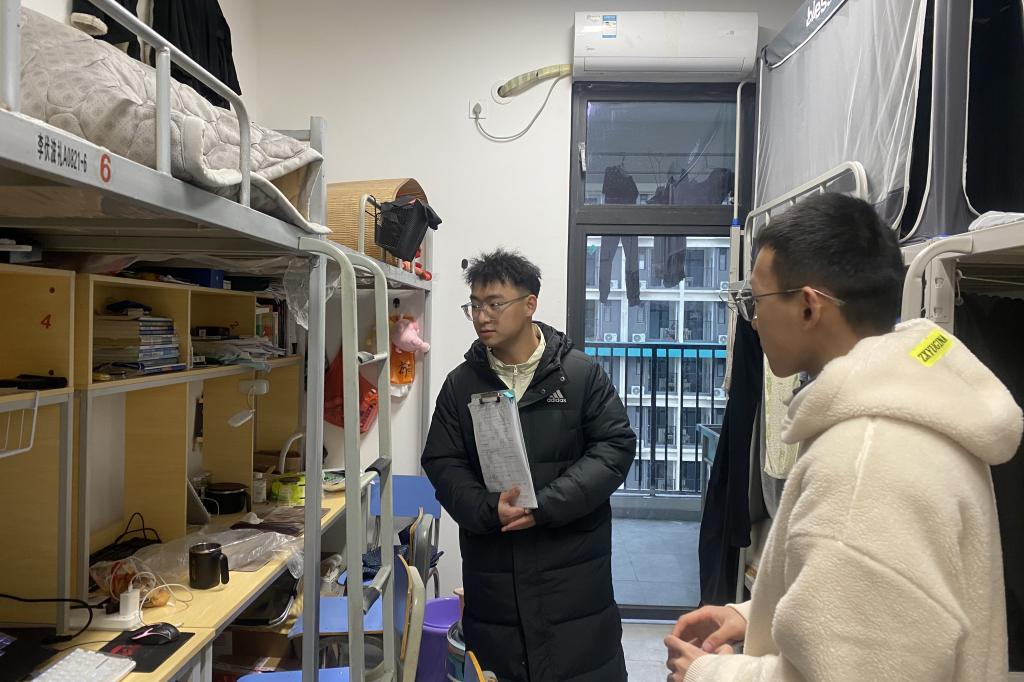 走访期间,辅导员深入学生宿舍,细心检查学生宿舍是否存在违规用电和使用大功率电器情况,查看宿舍环境卫生情况,记录各个寝室的查寝情况,强调宿舍安全的重要性。