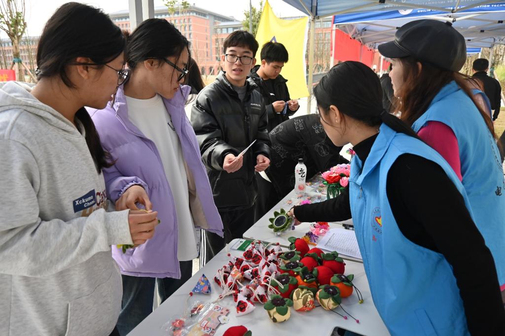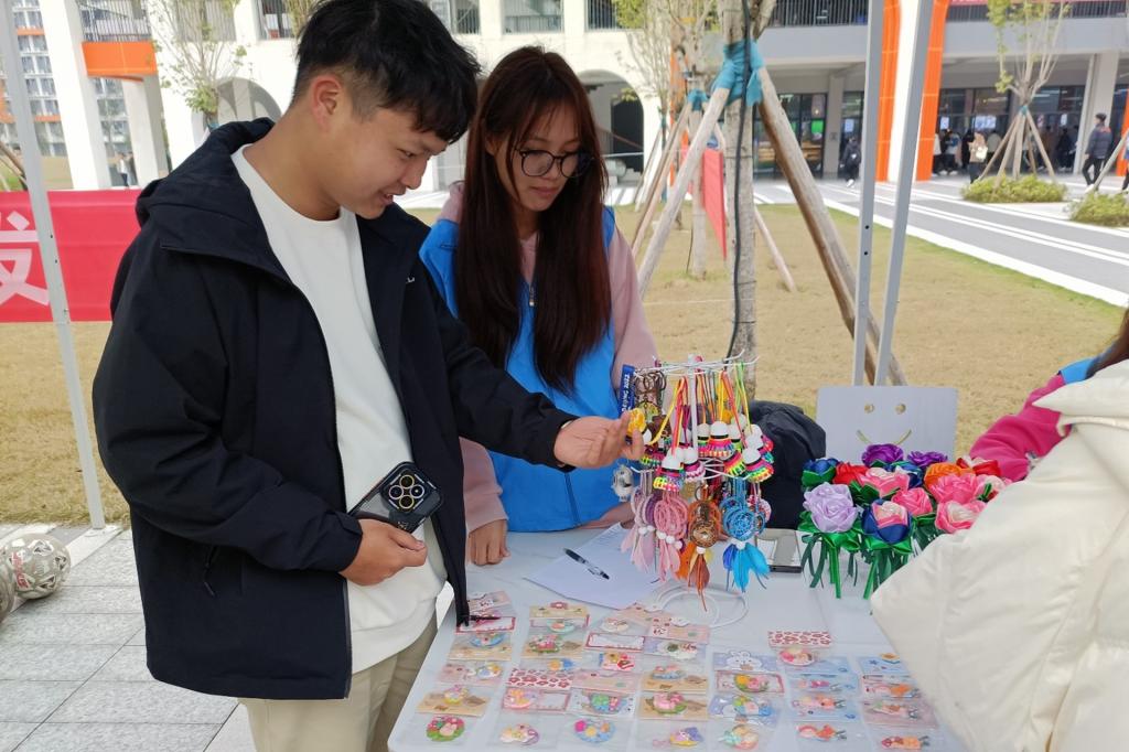 本次活动的所有义卖手工艺品全部由心智障碍者亲手制作。志愿者们在活动场地摆放了义卖手工艺品,手工艺品包含有精致的布艺香包,色彩缤纷的挂件,创意十足的串珠摆件等物品。志愿者们详细地为大家介绍此次义卖的物品,吸引了众多师生驻足选购,用实际行动支持爱心活动。