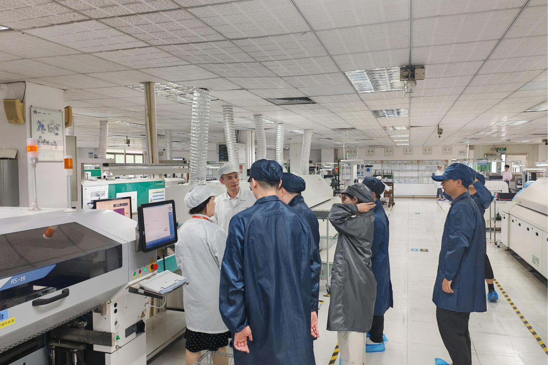 活动中,师生们首先走进企业生产车间,跟随企业技术人员沿产线从元器件加工到成品检测的各环节进行走访,直观感受企业的生产模式与技术应用场景,让学生对行业实际生产有了具象化认知。随后,团队与企业资深工程师开展针对性交流。工程师代表将专业知识与产线实际结合,细致讲解制造过程中“为什么这么做”,让大家对电子制造的实际运作有了更清晰的理解。