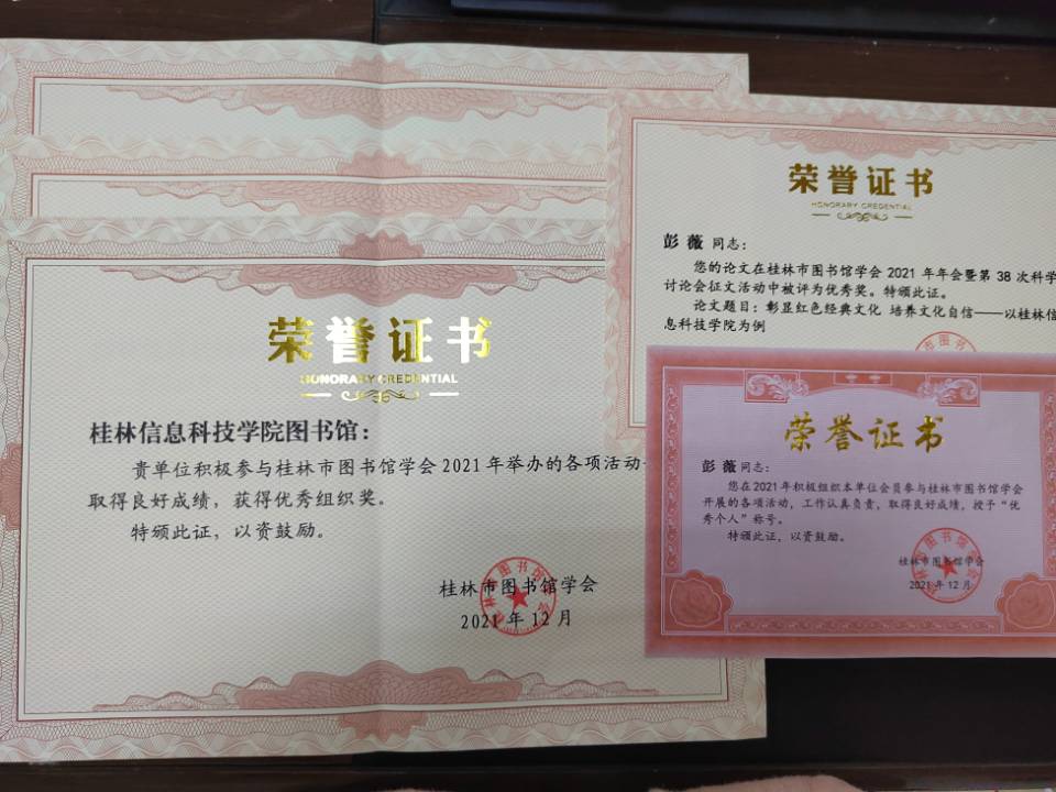 近日,桂林市图书馆学会公布了2021年度“阅百年历程,传精神力量”主题活动获奖名单,beat365图书馆馆员在学术征文、优秀阅读推广案例征集活动均获得佳绩。其中彭薇等策划的《文化育人视域下高校图书馆多方联动开展红色经典阅读推广活动》、肖莹莹等策划的《“四史”主题读书分享会》两项阅读推广案例,被评为年度优秀阅读推广案例;同时,beat365图书馆获评优秀组织奖、彭薇老师获评优秀个人,论文《彰显红色文化,培养文化自信——以beat365官方网站为例》入选优秀论文。