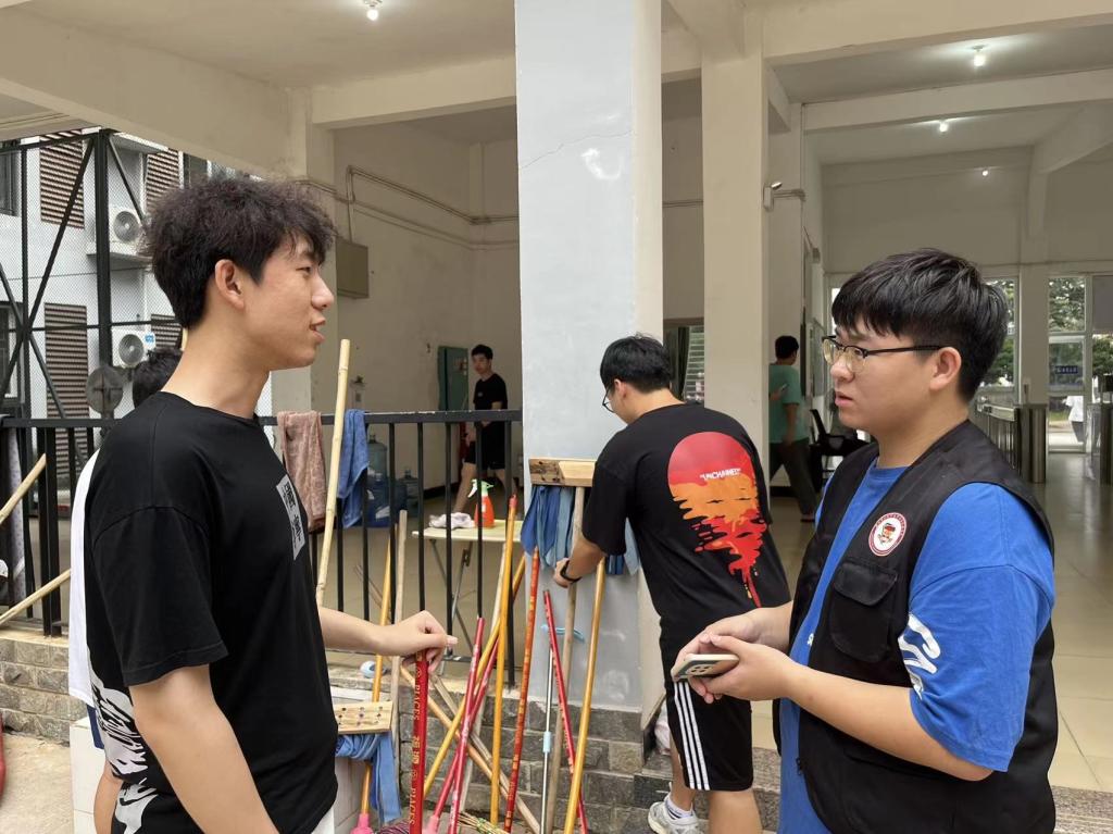 汛期过后,学校教学楼、学生公寓、校园道路等多区域积水严重、淤泥和垃圾堆积。为保障校园正常教学生活秩序和师生安全,全校上下积极应对,相关部门迅速开展校园卫生清理和环境消杀工作。机电工程学院2021级入党积极分子成立“雷锋志愿服务队”,主动协助图书馆人员参加防汛,纷纷拿着扫帚、水桶、拖布等,积极投入到二号公寓图书馆的积水清理工作;电子工程学院院长韩桂明、党总支书记庄璧瑛深入学生宿舍,走访了积水较严重的6号公寓1楼3区的学生宿舍,查看宿舍受潮发霉,水退后的清理情况,了解到同学们的学习生活已经恢复正常。电子工程学院21级学生齐浩哲同学表示:虽然这场连续暴雨来得很迅猛,但学校领导第一时间到宿舍慰问我们,带领我们第一时间投入抗击洪水的战斗,极大的鼓舞了我们抗击洪水的决心,大家都辛苦了一夜,但是一大早老师们还淌过积水为我们送来了早餐,让我们感受到了像在家一样的温暖。