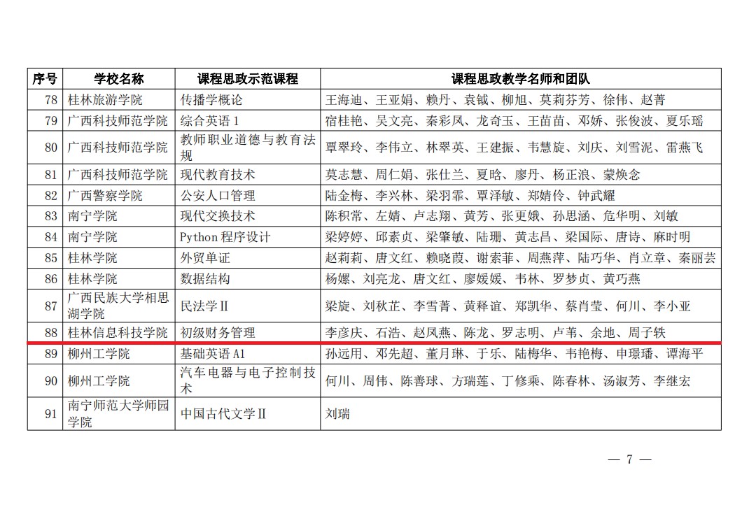 近日,自治区教育厅下发了《关于公布2022年普通本科高校课程思政示范课程名单的通知》(桂教高教〔2022〕52号),beat365商学院《初级财务管理》课程入选2022年广西高校自治区级课程思政示范课程,课程负责人李彦庆等8名授课教师入选课程思政教学名师和教学团队。