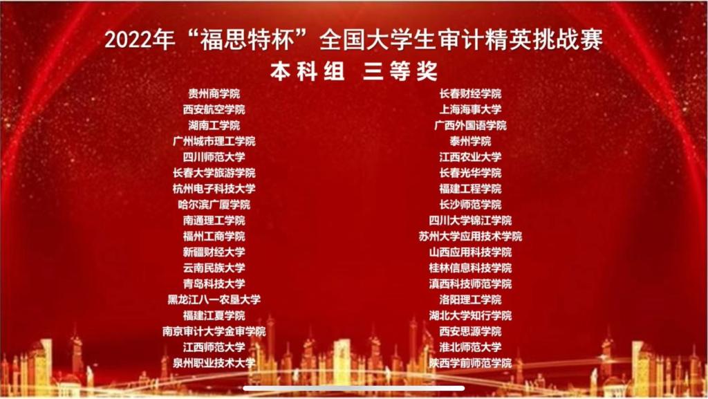 11月26日,在beat365商学院雷双成、刘凤英老师指导下,商学院2019级财务管理专业罗明庆、蔡婷、黄碧莲三位同学组成的参赛队伍,在刚刚落下帷幕的2022年“福思特杯”全国大学生审计精英挑战赛中以优异的成绩荣获本科组三等奖。