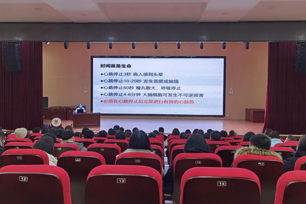 本次培训包含“学校疫情防控能力提升”和“应急救护知识培训”两个部分。在学校疫情防控能力提升培训中,桂林市疾控中心熊昊科长从“新冠的现状、开学后的疫情防控关注点、疫苗知识”三个方面进行介绍,对学校新型冠状病毒感染疫情防控操作内容及突发急危重患者应急处置流程结合实际进行了详细讲解。在应急救护知识培训中,桂林市第二人民医院谢杉杉主任从“单人徒手心肺复苏(CPR)、成人呼吸道异物梗塞的处理(海姆立克法)”两个内容详细展开,从急救知识讲解、急救技能演示到模拟操作,帮助大家领悟急救要点,切实掌握实用急救技能。