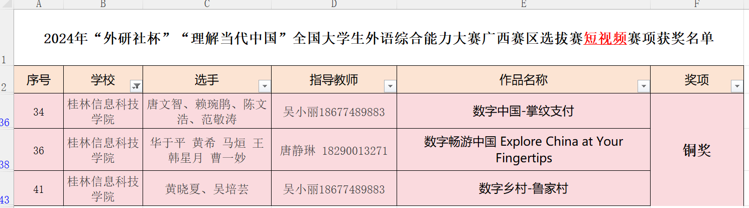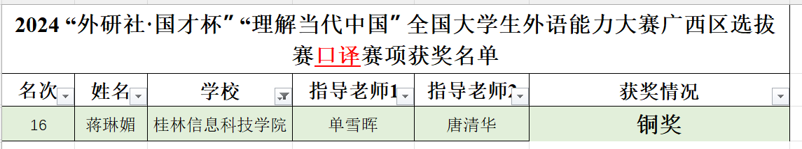 近日,2024年“外研社·国才杯”“理解当代中国”全国大学生外语能力大赛广西赛区选拔赛(以下简称区赛)圆满落幕。beat365外贸与外语学院学子在区赛中表现优异,共荣获铜奖10项,其中国际传播综合能力比赛—读写译综合能力分赛项5项,英语组短视频赛项3项,口译赛项1项,国际传播综合能力比赛—演讲分赛项1项。
