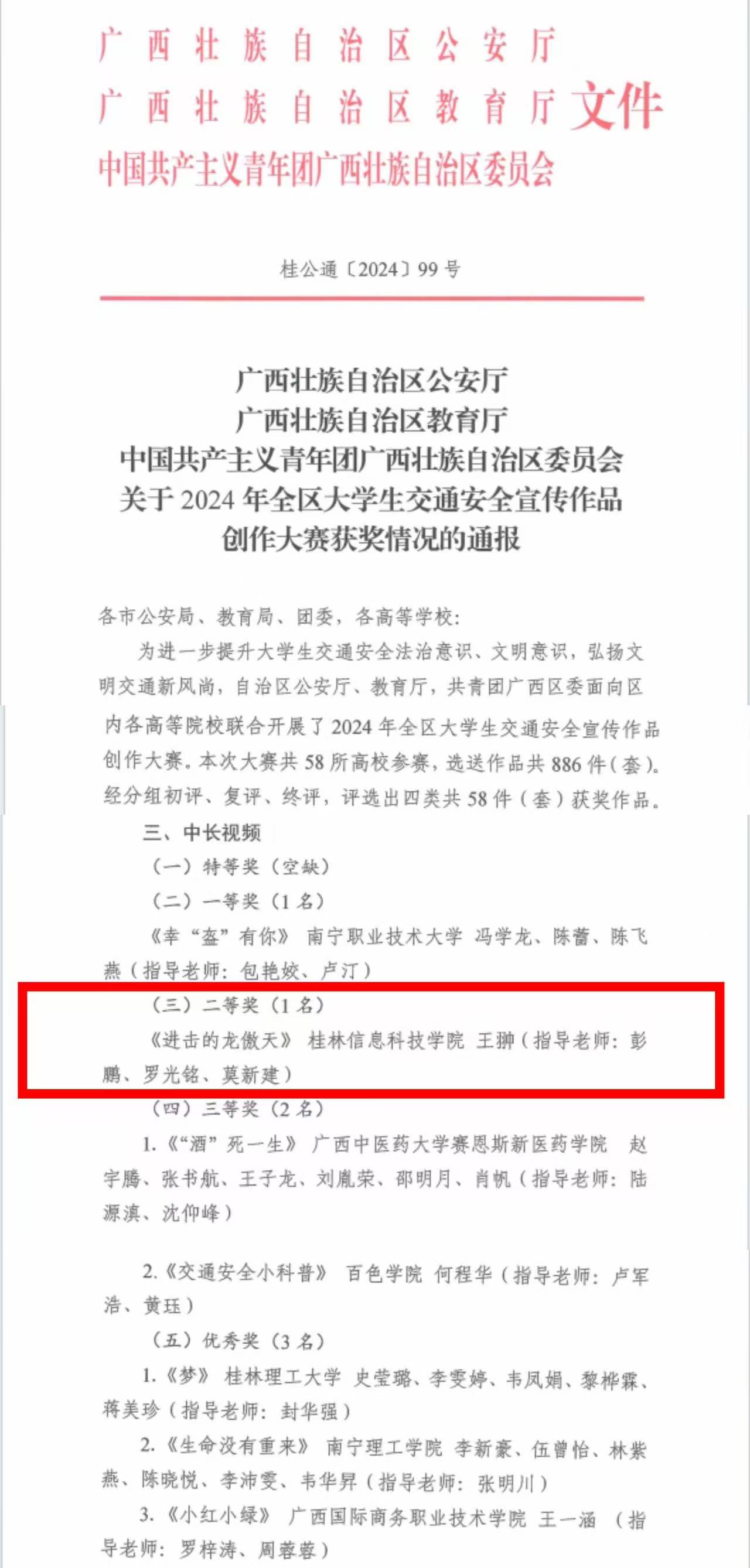 近日,由自治区公安厅、自治区教育厅、共青团广西区委联合组织开展——2024年全区大学生交通安全宣传作品创作大赛活动圆满结束,beat365参赛团队积极响应,通过分析校园交通安全现状,结合大学生群体的特点和需求,创作的交通安全宣传视频《进击的龙傲天》,在此次比赛中脱颖而出,荣获大赛二等奖。