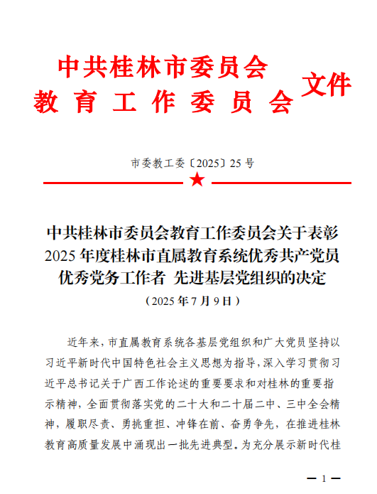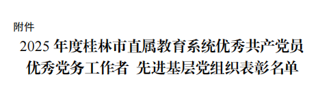 近日,桂林市委教育工作委印发《中共桂林市委员会教育工作委员会关于表彰2025年度桂林市直属教育系统优秀共产党员 优秀党务工作者 先进基层党组织的决定》(市委教工委〔2025〕25 号),学校党委获评“先进基层党组织”荣誉称号,廖星男等6名同志获评“优秀共产党员”荣誉称号,吕丽同志荣获“优秀党务工作者”荣誉称号!