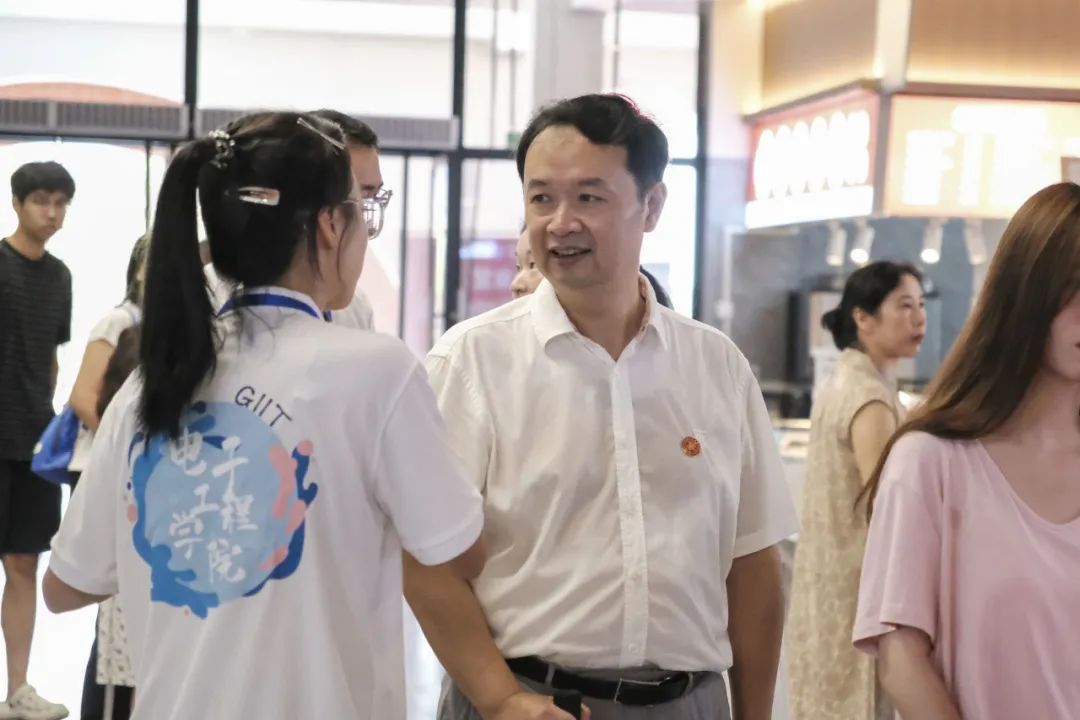 学校党委书记甘勇(中)、副书记李飞(右一)走访迎新现场