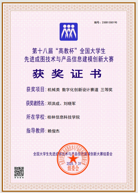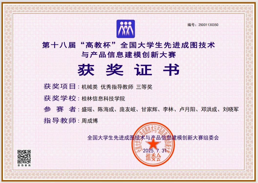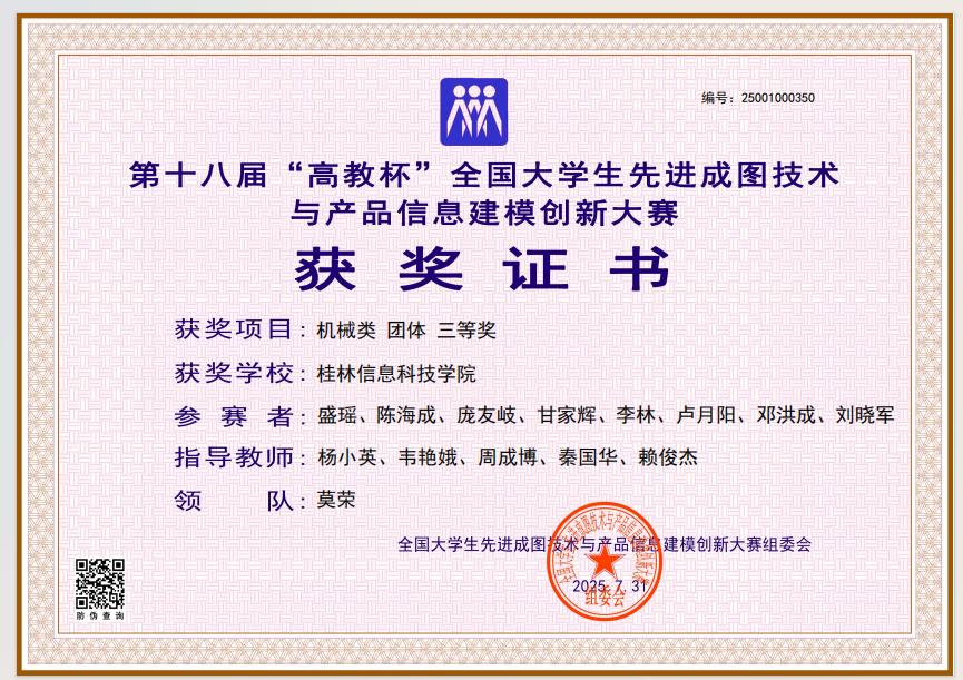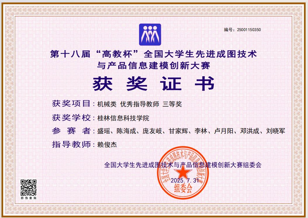 在本届大赛中,beat365机电工程学院牵头组织参赛工作,院长助理莫荣担任领队,机械设计制造及其自动化教研室主任、银龄教师王丽娟教授统筹规划,为选手提供全流程专业指导与资源保障。参赛团队展现出深厚的工程图学功底、精湛的建模技艺及突出的创新思维,最终荣获机械类团体全国三等奖1项,先进成图技术赛道、数字化创新设计赛道全国三等奖各1项;莫荣、王丽娟等5名指导教师因教学成效显著,获评“优秀指导老师”。